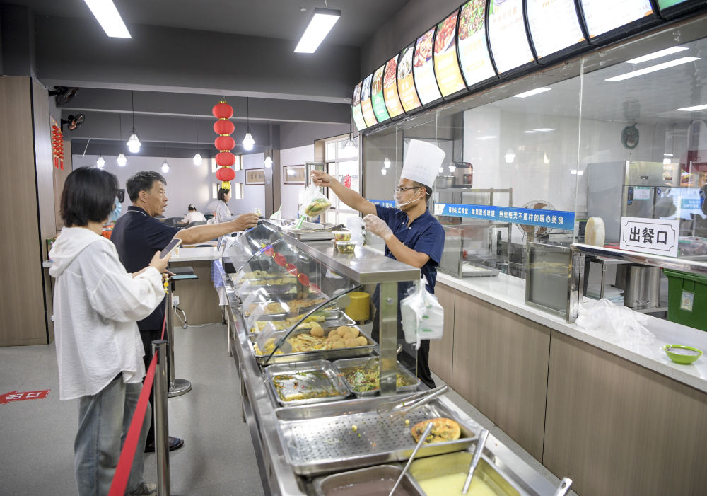 6月20日,寧夏銀川市金鳳區(qū)長城花園社區(qū)居民在社區(qū)食堂買早餐。