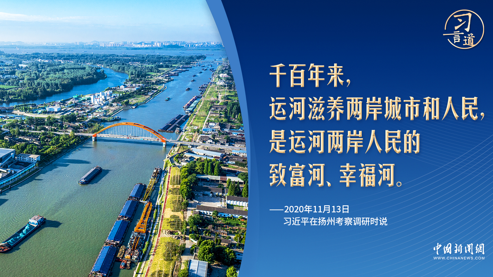 “千百年來,運河滋養(yǎng)兩岸城市和人民,是運河兩岸人民的致富河、幸福河?!?020年考察揚州運河三灣生態(tài)文化公園時,習近平一句“致富河、幸福河”指出了運河保護的更深意涵。