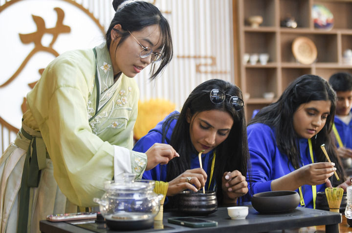 2024年4月15日,參加2024年“漢語橋”上合組織國家青年學(xué)生春令營的來華青年學(xué)生在新疆師范大學(xué)學(xué)生(左)的指導(dǎo)下學(xué)習(xí)茶藝。