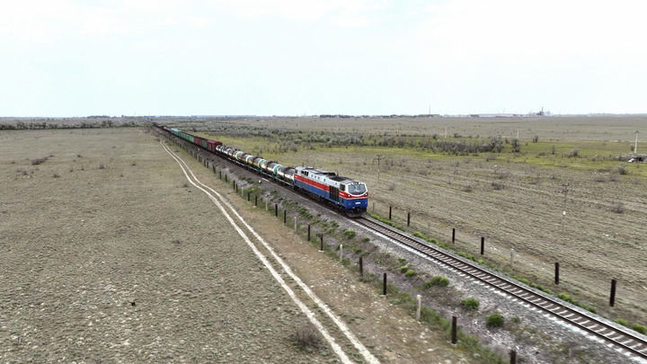 2023年5月12日,在哈薩克斯坦阿拉木圖附近,貨運(yùn)列車馳騁于阿拉木圖與中國霍爾果斯間(無人機(jī)照片)。