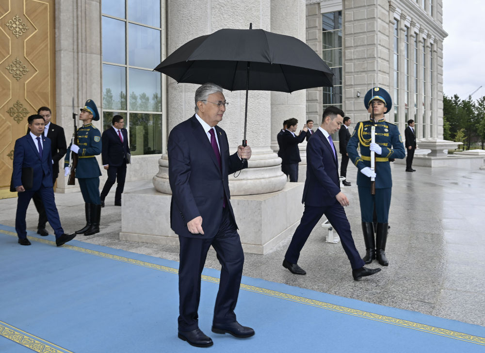 托卡耶夫?yàn)榱?xí)近平舉行隆重歡迎儀式。總統(tǒng)府大廳氣勢(shì)恢宏,禮兵威武挺拔。兩國(guó)元首分別同對(duì)方陪同人員一一握手致意。兩國(guó)元首登上檢閱臺(tái),軍樂(lè)團(tuán)奏中哈兩國(guó)國(guó)歌。習(xí)近平在托卡耶夫陪同下檢閱儀仗隊(duì)。