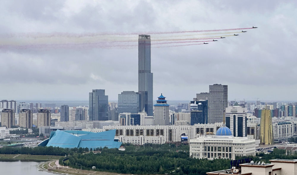 當(dāng)?shù)貢r(shí)間7月3日,國(guó)家主席習(xí)近平在阿斯塔納出席哈薩克斯坦總統(tǒng)托卡耶夫舉行的歡迎儀式。習(xí)近平乘車(chē)抵達(dá)總統(tǒng)府時(shí),托卡耶夫總統(tǒng)熱情迎接。六架哈薩克斯坦空軍戰(zhàn)機(jī)從總統(tǒng)府上空飛過(guò),拉出象征中國(guó)國(guó)旗的紅黃色彩煙,以最高禮儀歡迎習(xí)近平對(duì)哈薩克斯坦進(jìn)行國(guó)事訪問(wèn)。
