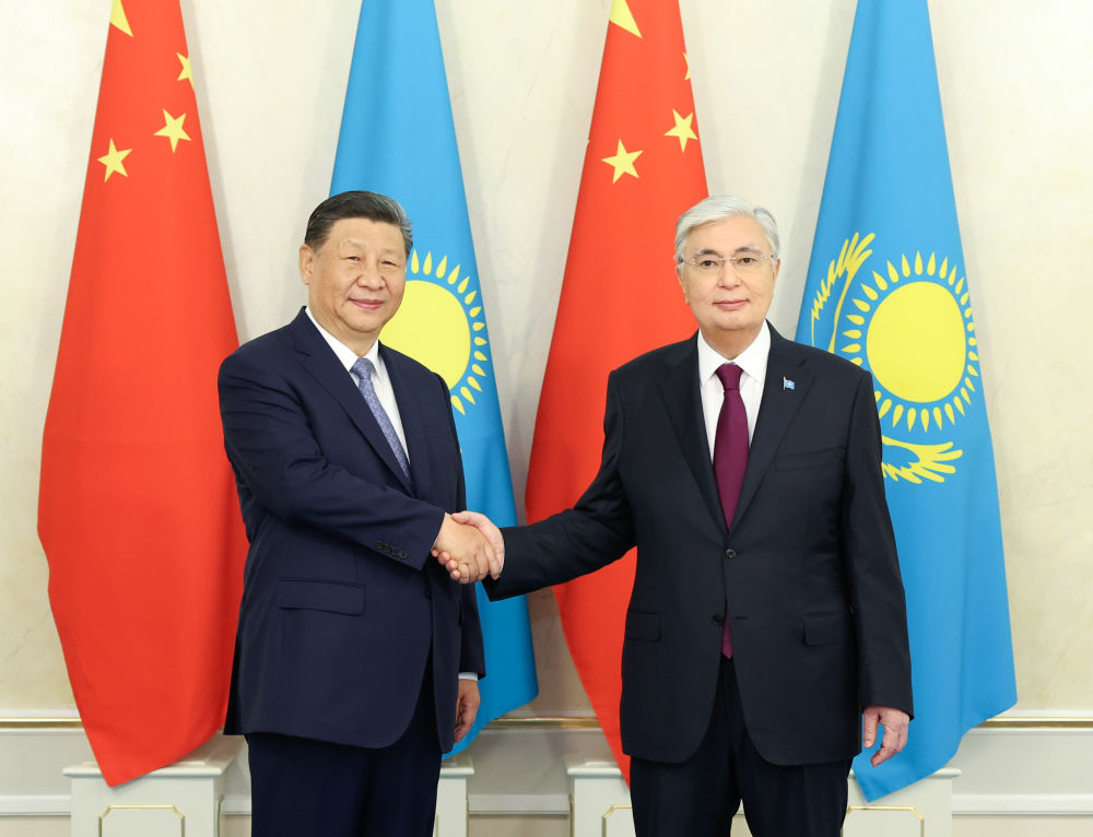 習(xí)近平在阿斯塔納總統(tǒng)府同托卡耶夫共同會(huì)見(jiàn)記者。
