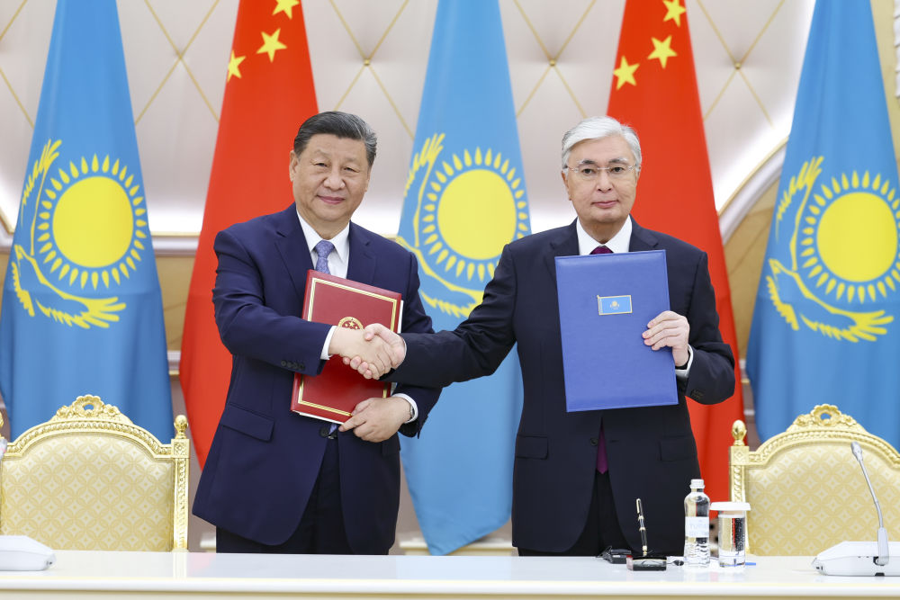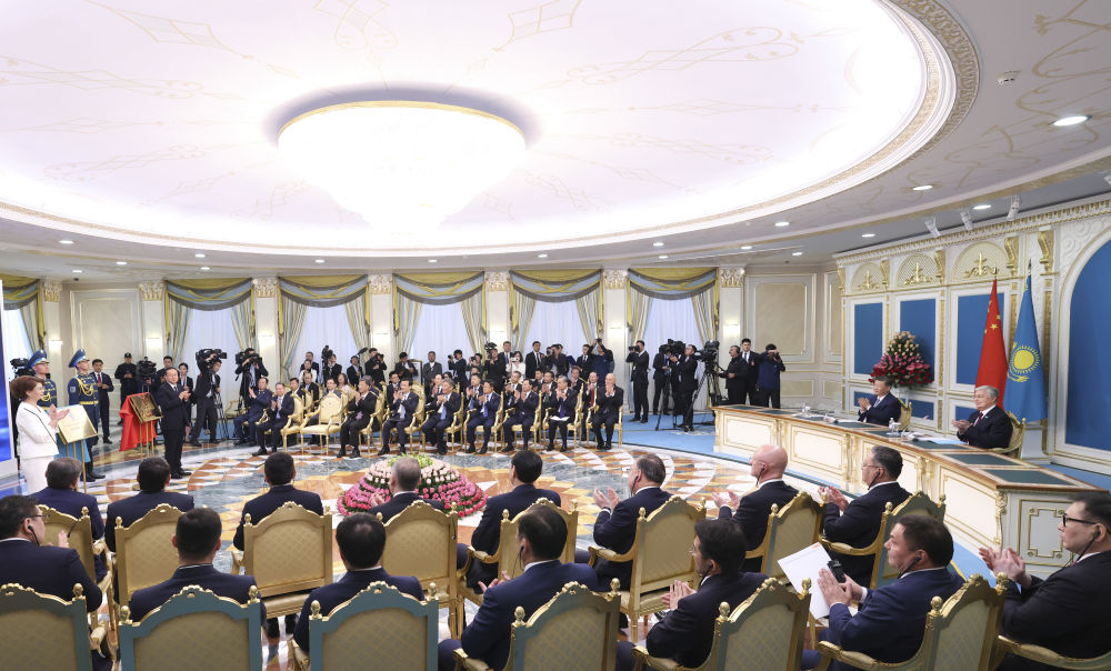 兩國(guó)元首共同簽署《中華人民共和國(guó)和哈薩克斯坦共和國(guó)聯(lián)合聲明》,并共同見(jiàn)證交換經(jīng)貿(mào)、互聯(lián)互通、航空航天、教育、媒體等領(lǐng)域數(shù)十項(xiàng)雙邊合作文件。