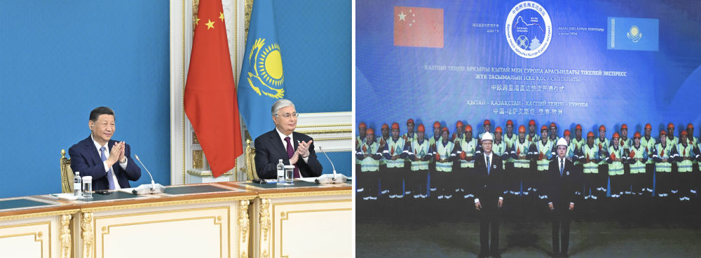 中午,習(xí)近平同托卡耶夫在阿斯塔納總統(tǒng)府以視頻方式共同出席中歐跨里海直達(dá)快運(yùn)開(kāi)通儀式。哈方項(xiàng)目負(fù)責(zé)人向兩國(guó)元首匯報(bào)準(zhǔn)備情況,中方項(xiàng)目負(fù)責(zé)人請(qǐng)兩國(guó)元首下達(dá)指令。兩國(guó)元首共同下達(dá)作業(yè)指令:“啟運(yùn)!”兩國(guó)元首通過(guò)大屏幕觀看車(chē)輛登船、集裝箱裝船等實(shí)時(shí)情況?,F(xiàn)場(chǎng)響起熱烈掌聲。