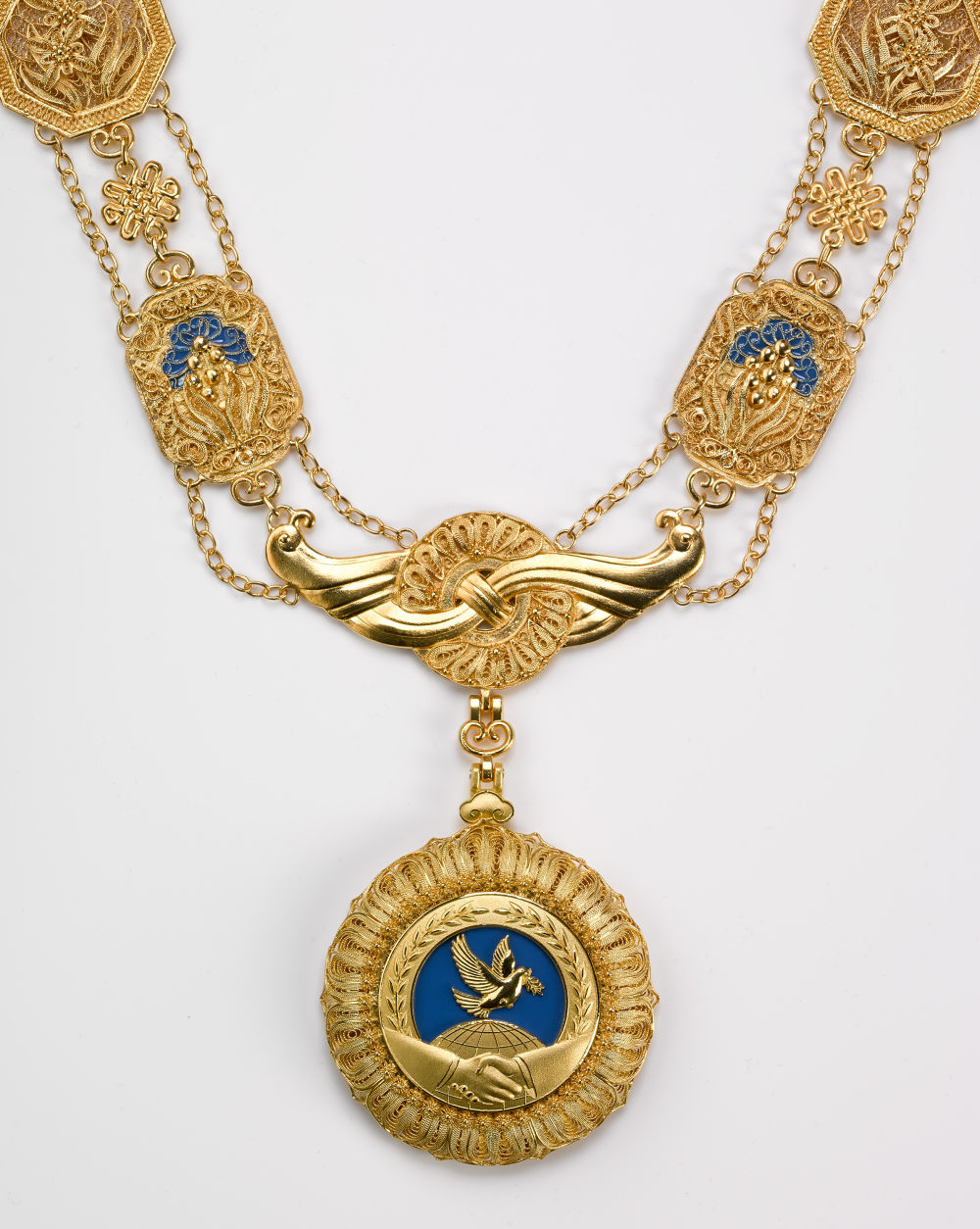 “友誼勛章”章體以金色、藍(lán)色為主色調(diào),采用和平鴿、地球、握手、荷花等元素,章鏈采用中國(guó)結(jié)、萬(wàn)年青、牡丹花、玉璧、蘭草等元素,整體采用花絲鑲嵌、掐絲琺瑯等傳統(tǒng)工藝手工制作。設(shè)計(jì)制作象征中國(guó)人民同各國(guó)人民友好團(tuán)結(jié)、友誼長(zhǎng)存,祝愿世界各國(guó)共同繁榮發(fā)展。