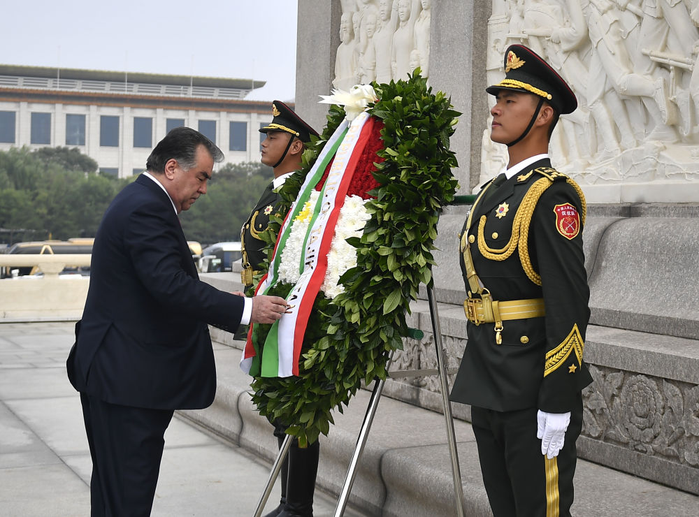 2017年8月31日,塔吉克斯坦總統(tǒng)拉赫蒙前往北京天安門(mén)廣場(chǎng),向人民英雄紀(jì)念碑敬獻(xiàn)花圈。