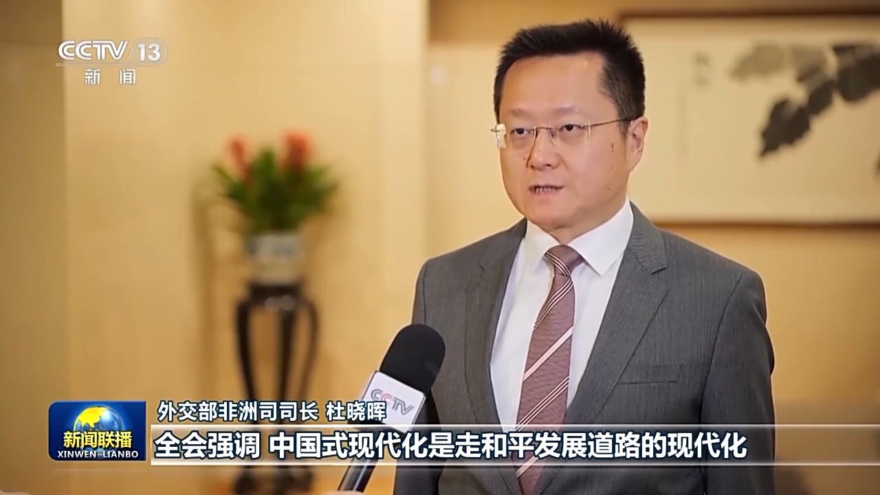 外交部非洲司司長 杜曉暉:全會強調(diào),中國式現(xiàn)代化是走和平發(fā)展道路的現(xiàn)代化,開放是中國式現(xiàn)代化的鮮明標識。在百年變局加速演進、世界進入新的動蕩變革期的大背景下,三中全會給世界注入和平力量、穩(wěn)定力量、進步力量、發(fā)展力量。我們將以習(xí)近平外交思想為指引,堅定奉行獨立自主的和平外交政策,推動構(gòu)建人類命運共同體,為以中國式現(xiàn)代化全面推進強國建設(shè)、民族復(fù)興偉業(yè)營造更有利國際環(huán)境、提供更堅實戰(zhàn)略支撐。