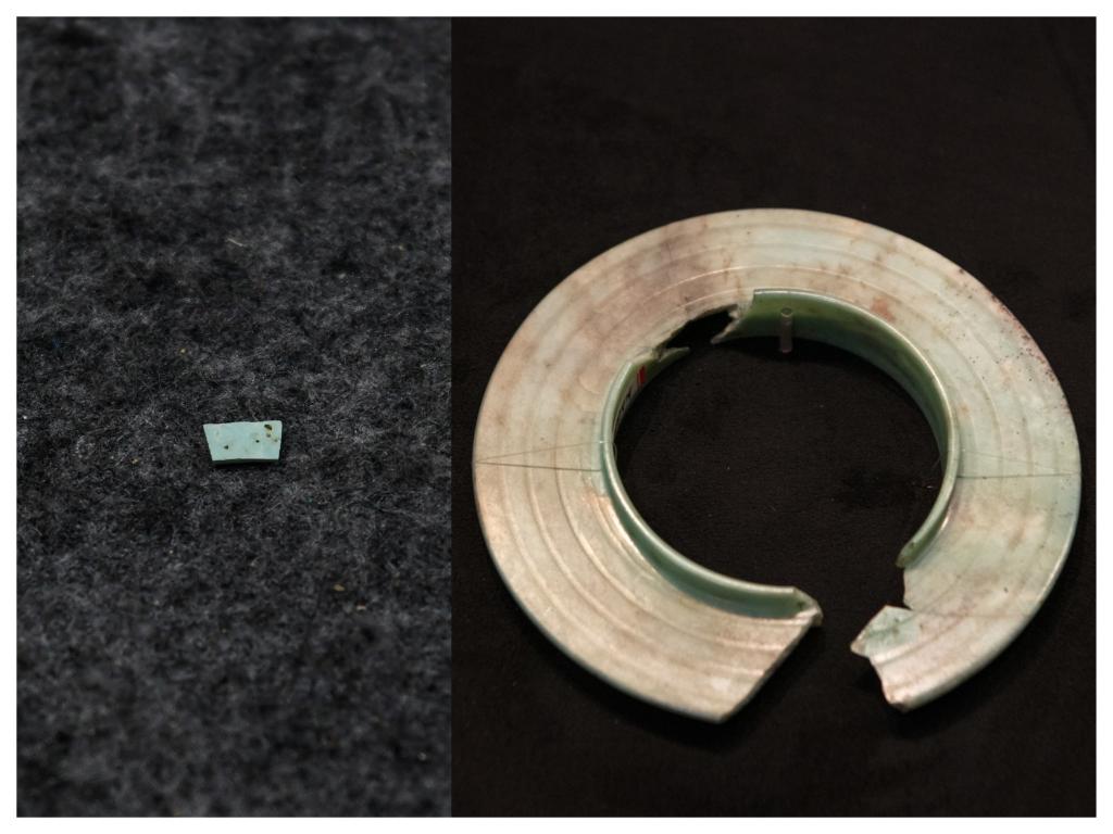 拼版照片:左圖為2024年7月10日拍攝的三星堆遺址出土的綠松石片(新華社記者王曦 攝),右圖為2024年7月21日在三星堆博物館文物保護(hù)與修復(fù)館拍攝的有領(lǐng)玉璧(新華社記者唐文豪 攝)。