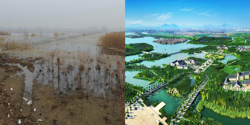 昔日的采煤塌陷區(qū)(左)被打造成濕地公園(右)(央廣網(wǎng)發(fā) 徐州市賈汪區(qū)攝影家協(xié)會(huì)供圖)