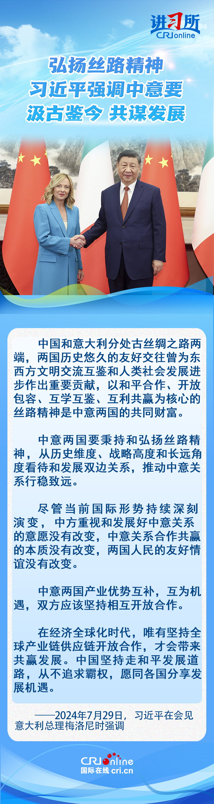 7月29日,中國國家主席習(xí)近平在北京會(huì)見來華進(jìn)行正式訪問的意大利總理梅洛尼。習(xí)近平指出,今年是中意建立全面戰(zhàn)略伙伴關(guān)系20周年和馬可·波羅逝世700周年,雙方汲古鑒今、共謀發(fā)展面臨重要機(jī)遇。