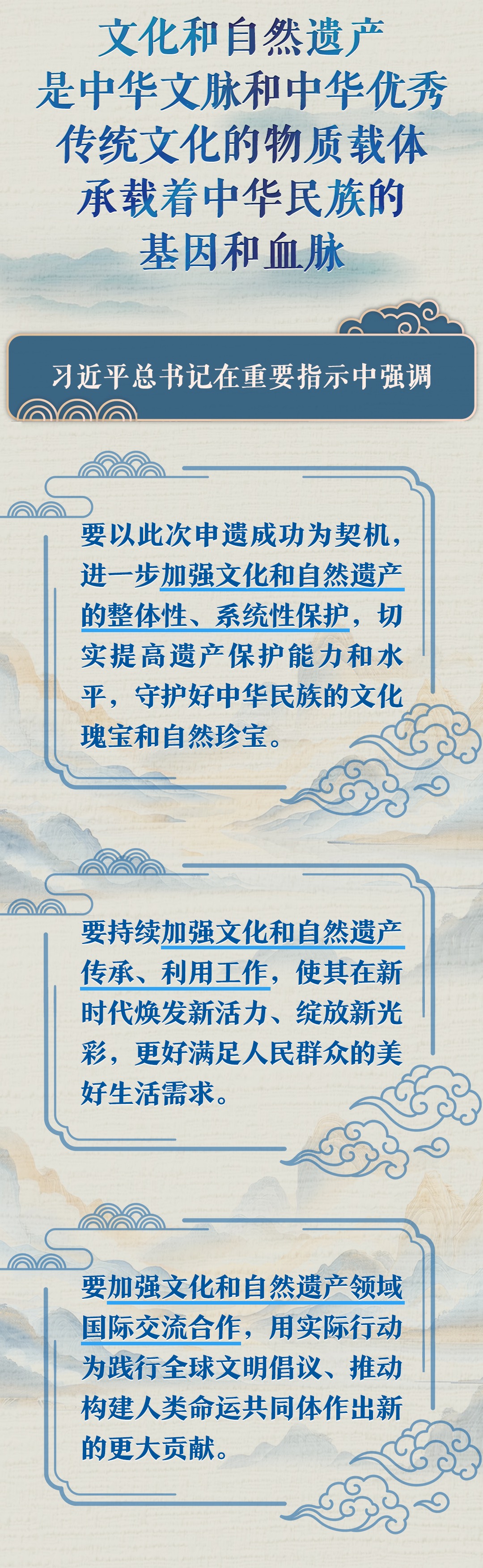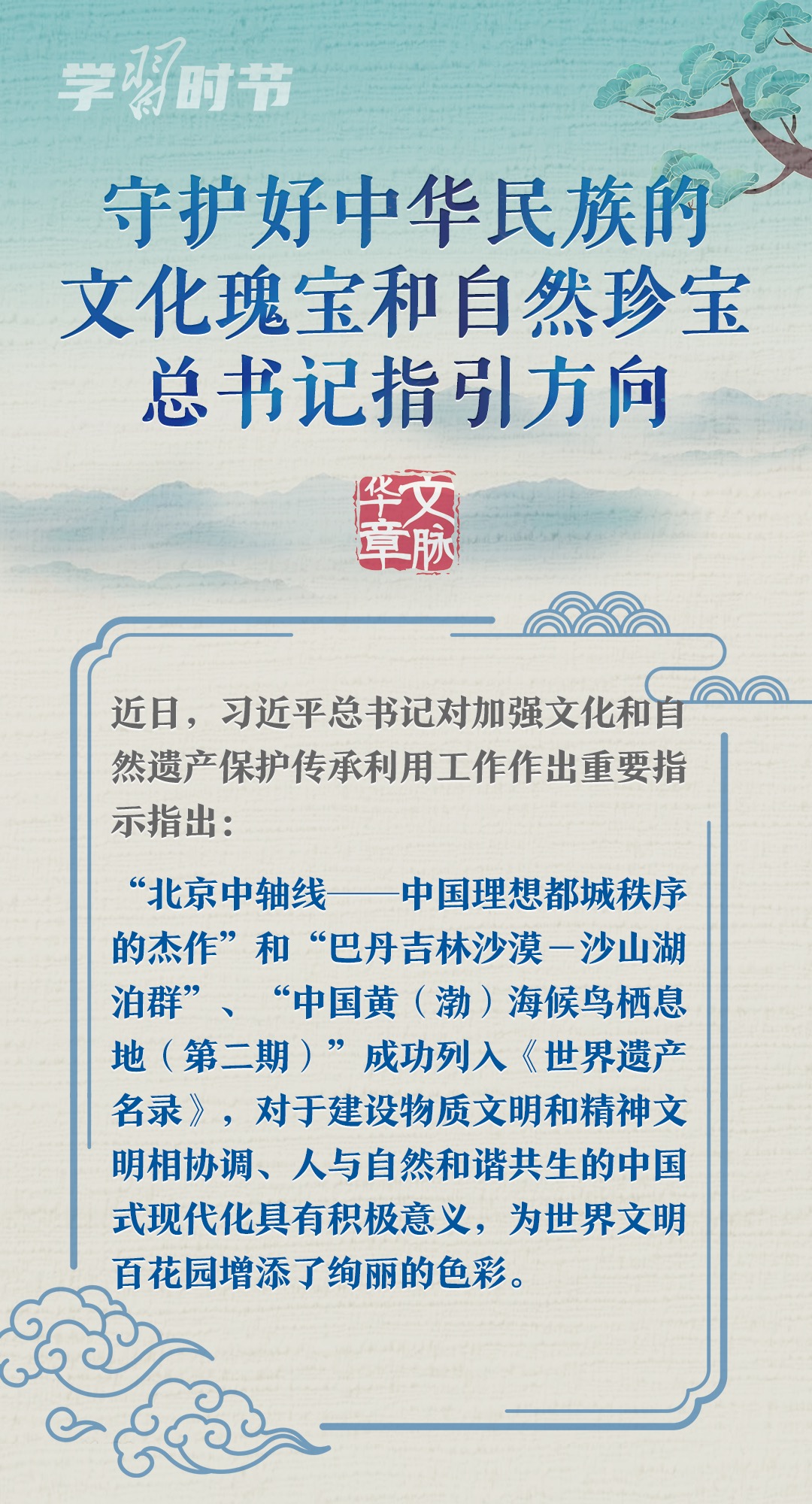 文化遺產(chǎn)體現(xiàn)了中華民族旺盛的生命力和創(chuàng)造力,自然遺產(chǎn)昭示了神奇的自然造化同中華民族的和諧依存關(guān)系。習(xí)近平總書記一直以來(lái)高度重視文化和自然遺產(chǎn)保護(hù)傳承利用工作,近日專門就此作出重要指示強(qiáng)調(diào),守護(hù)好中華民族的文化瑰寶和自然珍寶,讓文化和自然遺產(chǎn)在新時(shí)代煥發(fā)新活力綻放新光彩。讓我們一同學(xué)習(xí)。