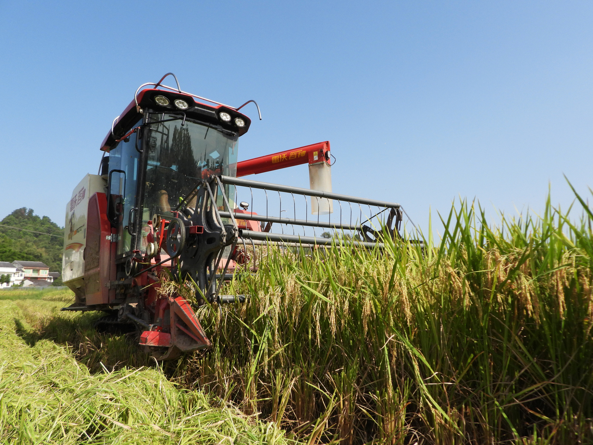 四川省達(dá)州市村民駕駛收割機(jī)收獲水稻