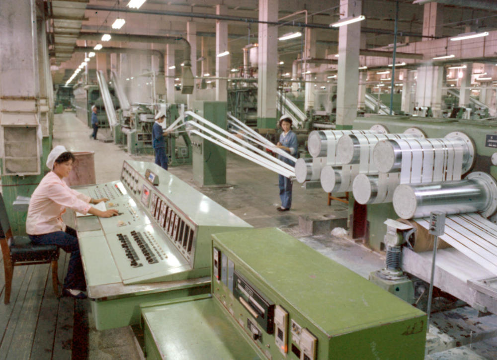 1981年,東北遼陽石油化學(xué)纖維廠抽絲車間一角。新華社發(fā)
