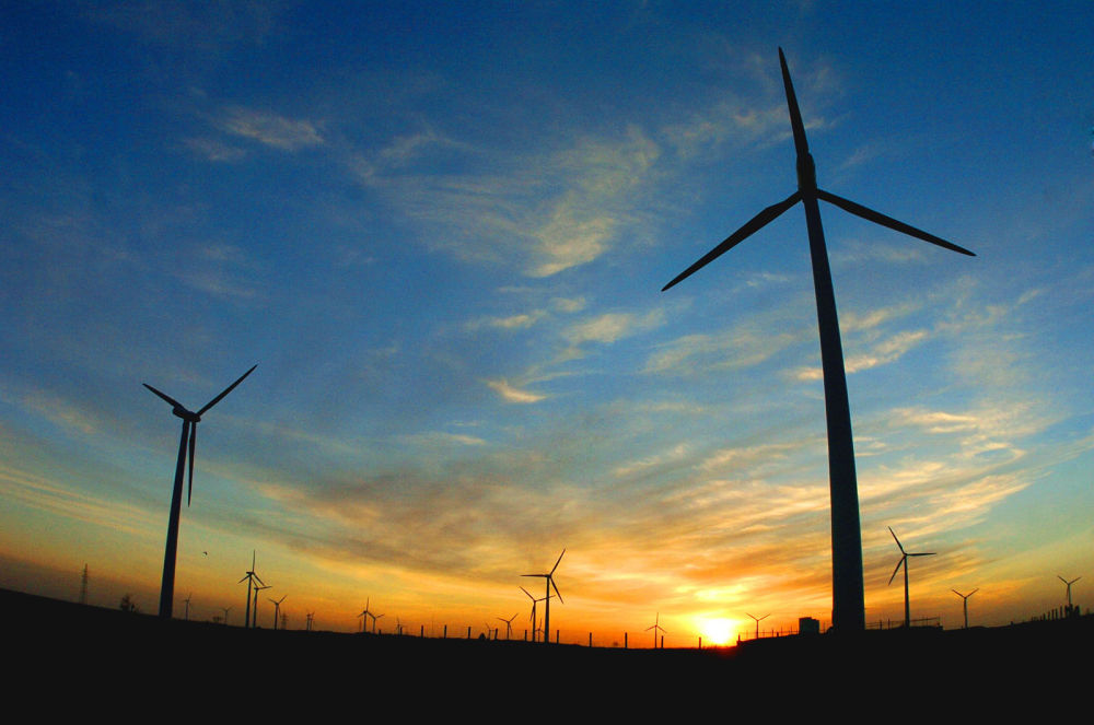2005年,吉林省白城市通榆縣境內(nèi)幾十部風(fēng)力發(fā)電機(jī)組在工作。新華社發(fā)