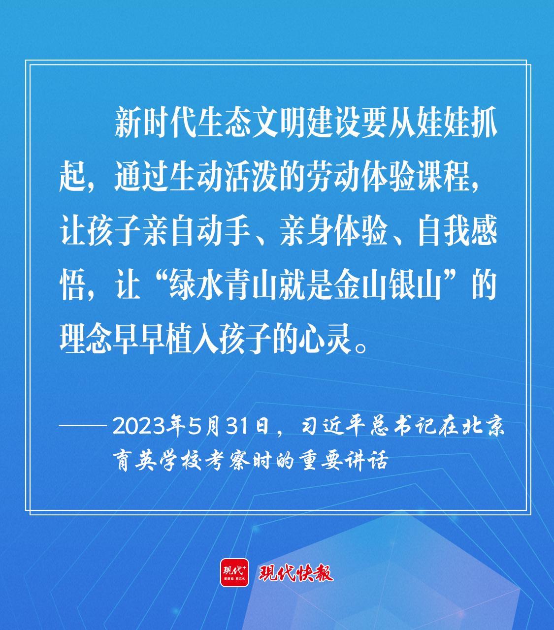 2023年5月,習(xí)近平總書記在北京育英學(xué)??疾鞎r(shí)強(qiáng)調(diào),新時(shí)代生態(tài)文明建設(shè)要從娃娃抓起,通過生動(dòng)活潑的勞動(dòng)體驗(yàn)課程,讓孩子親自動(dòng)手、親身體驗(yàn)、自我感悟,讓“綠水青山就是金山銀山”的理念早早植入孩子的心靈。