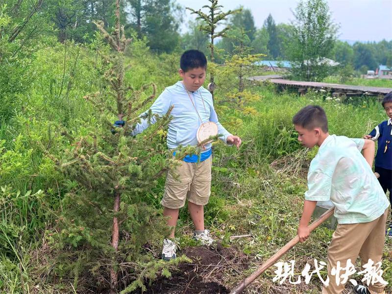 這樣的美麗風(fēng)景讓第一次來到大草原的周云昊很興奮?!拔覀儚漠?dāng)?shù)亓私獾?,這是一代又一代人努力的結(jié)果,讓我們也深切感受到生態(tài)保護(hù)的重要性?!毖袑W(xué)途中,周云昊和小伙伴們還專門在當(dāng)?shù)亓謭?chǎng)種下一棵樹?!跋M芙】甸L大,成為守護(hù)綠色草原的小衛(wèi)士?!?/p>