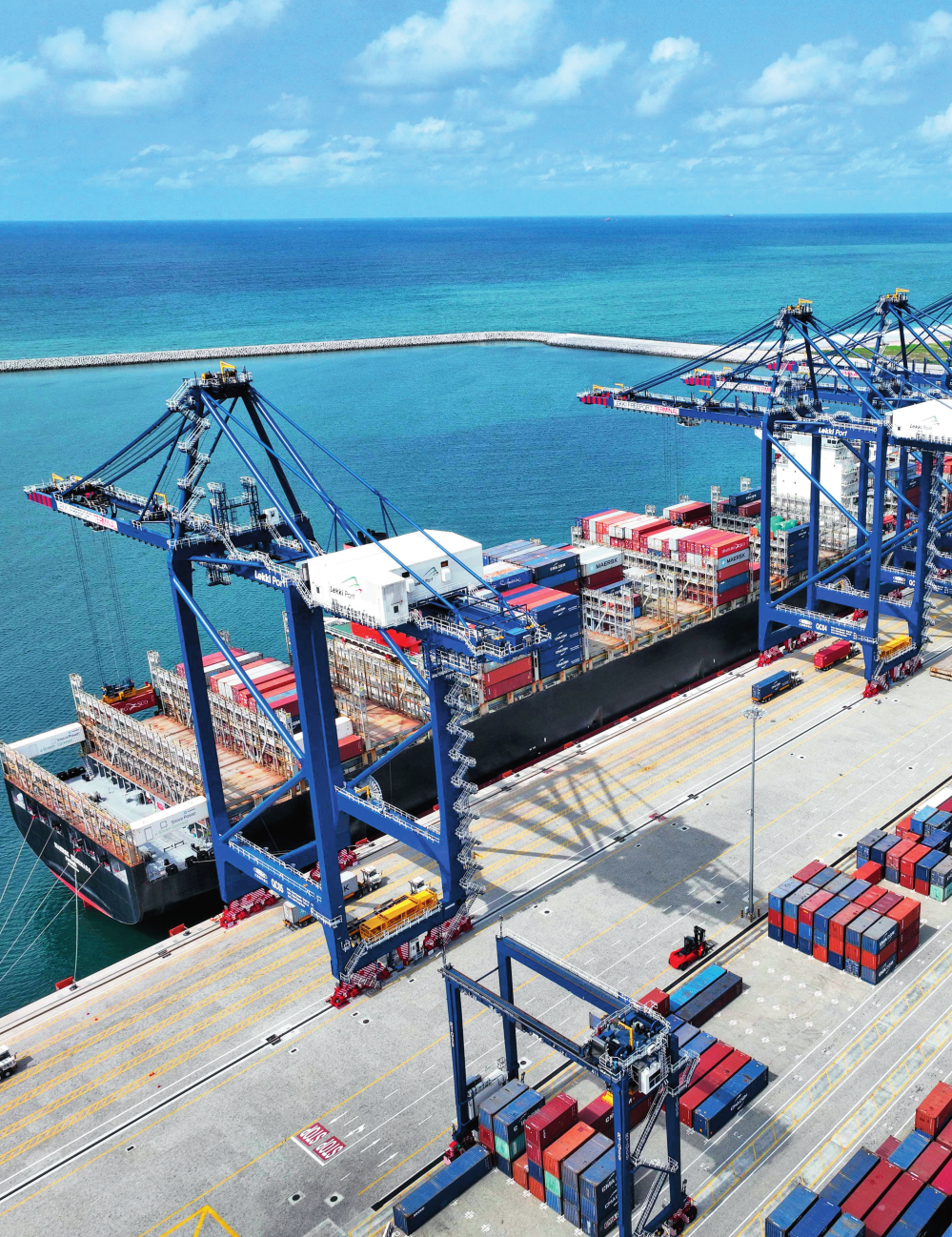 由中國港灣工程有限責(zé)任公司承建的尼日利亞萊基深水港位于中尼合作建設(shè)的拉各斯萊基自貿(mào)區(qū)內(nèi),是尼日利亞首個(gè)現(xiàn)代化深水港和最大港口。圖為一艘貨輪在尼日利亞拉各斯萊基深水港裝卸集裝箱(2024 年 3 月 11 日攝)萊基港公司供圖