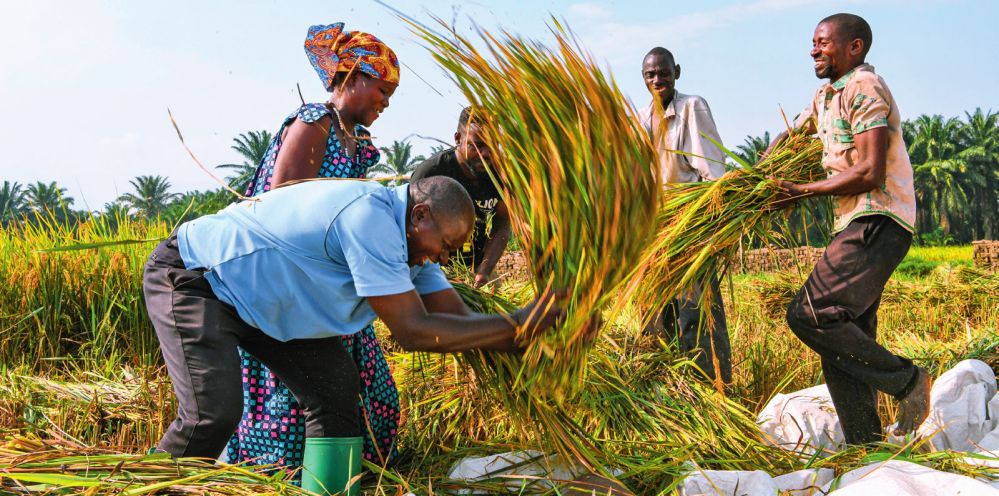 2018 年,中國農(nóng)業(yè)專家組在布隆迪布班扎省吉漢加縣設(shè)立首個(gè)水稻減貧示范村。圖為當(dāng)?shù)剞r(nóng)戶在稻田里給雜交水稻脫粒(2023年6月20日攝) 韓旭攝 / 本刊