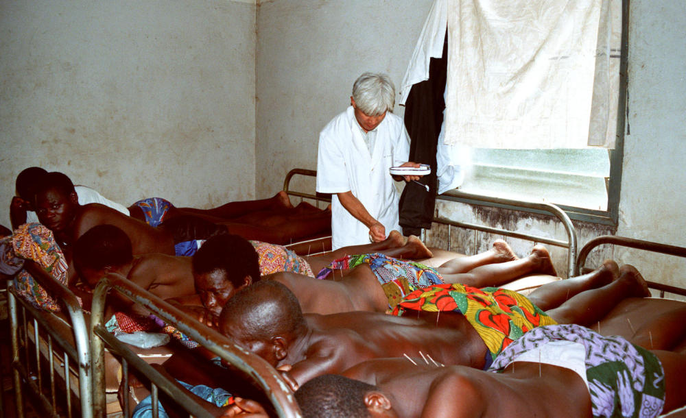 1995年,中國醫(yī)生在多哥卡拉地區(qū)醫(yī)院門診部為患者進(jìn)行針灸治療。