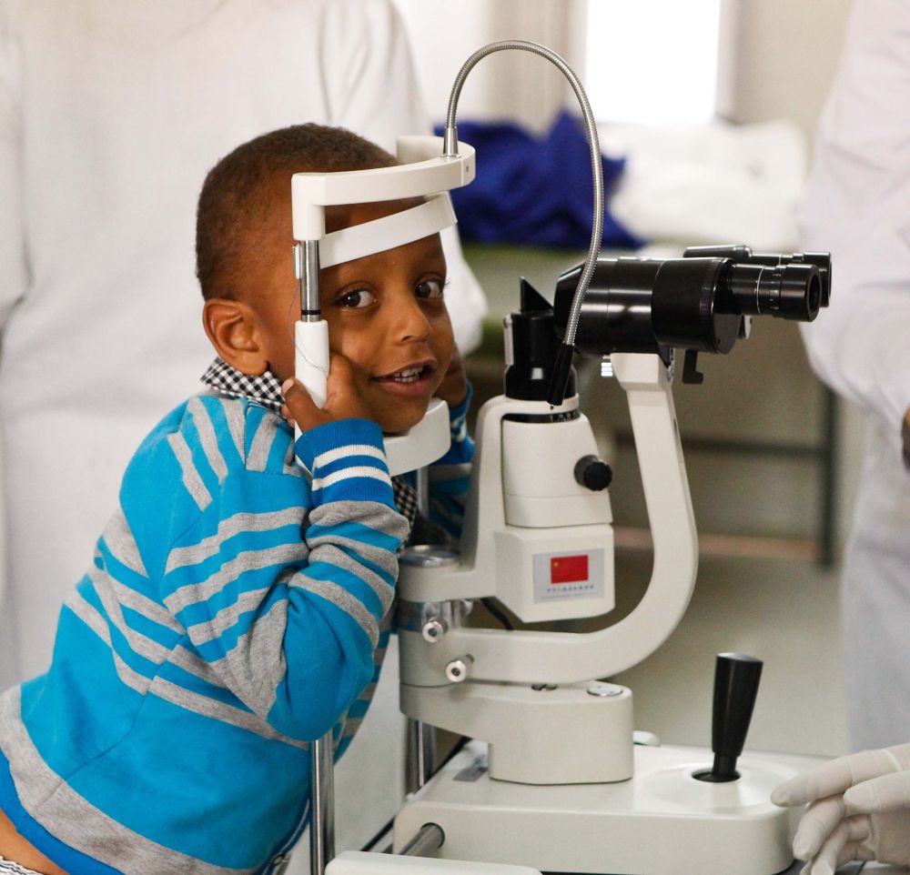 2014年5月2日,在埃塞俄比亞首都亞的斯亞貝巴的阿勒特醫(yī)院,一名小朋友等待參加“光明行”活動(dòng)的中國眼科專家為他看診。