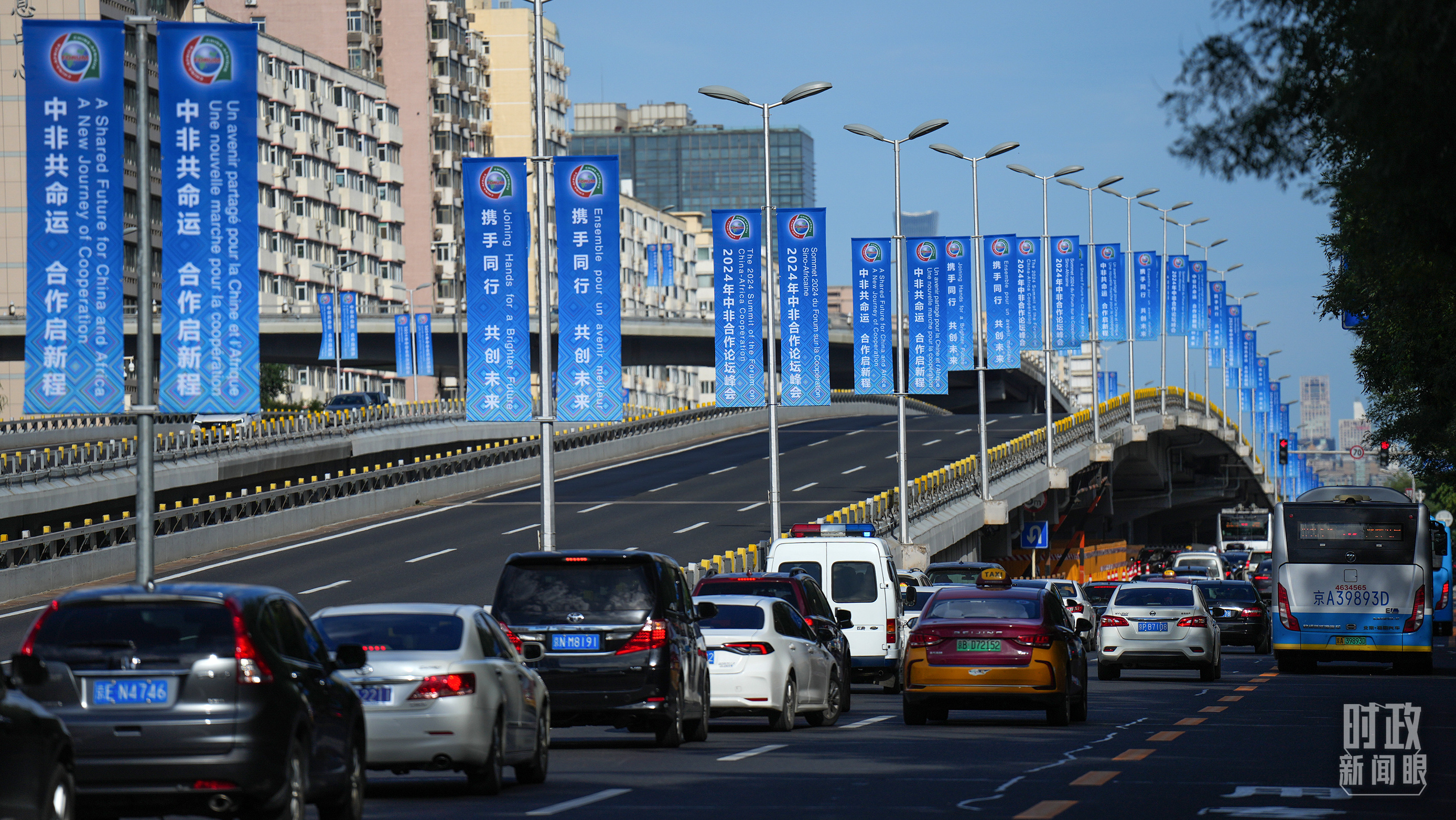 北京街頭懸掛的2024年中非合作論壇峰會(huì)旗幟。(總臺(tái)央視記者陳漢章拍攝)