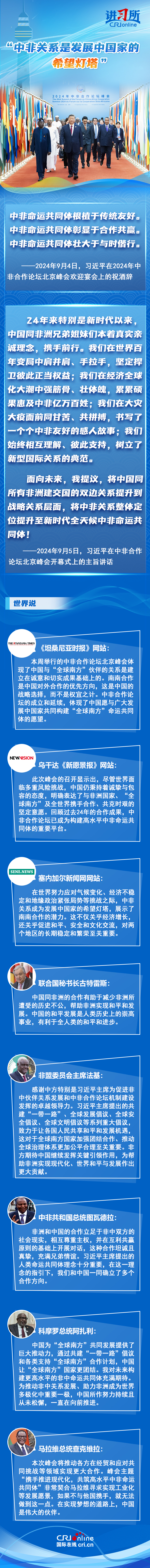從宣布建立“新型伙伴關(guān)系”,到整體定位提升至“新時代全天候中非命運共同體”,成立24年的中非合作論壇不斷推動中非關(guān)系實現(xiàn)跨越式發(fā)展,特別是新時代以來,中國本著真實親誠理念,同非洲兄弟姐妹們攜手前行,受到非方廣泛稱贊。非方各界認(rèn)為,為推動非中關(guān)系發(fā)展、助力非洲成為世界多極化中重要一極,中國所作努力持續(xù)且從未松懈,中非關(guān)系是發(fā)展中國家的希望燈塔。