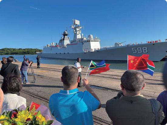 △聯(lián)合演習(xí)開始前一天,中國海軍日照艦抵達(dá)南非理查茲灣港口,受到歡迎