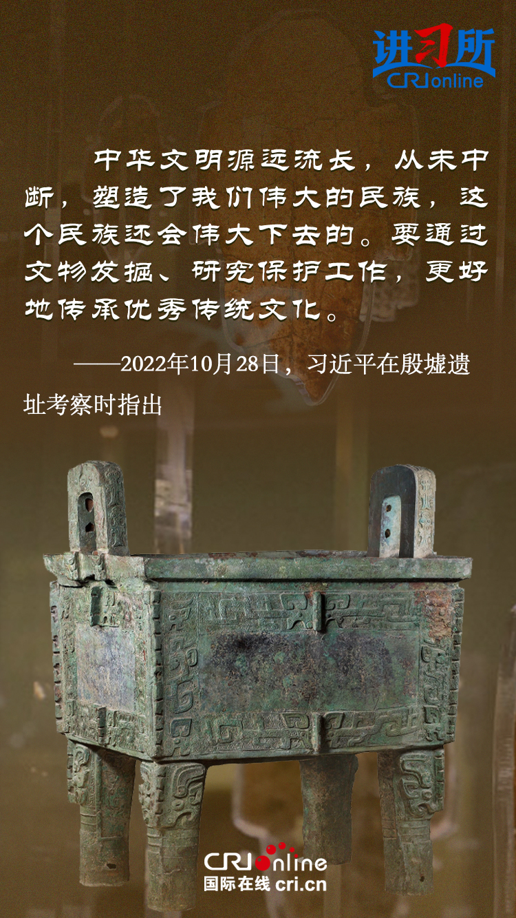 文物和文化遺產(chǎn)承載燦爛文明,傳承歷史文化,維系民族精神。三星堆博物館、殷墟遺址、敦煌研究院……這些年,習近平高度重視中華文明探源工程和文物保護工作,強調(diào)要把中華文明歷史引向深入,把中華優(yōu)秀傳統(tǒng)文化一代一代傳下去。