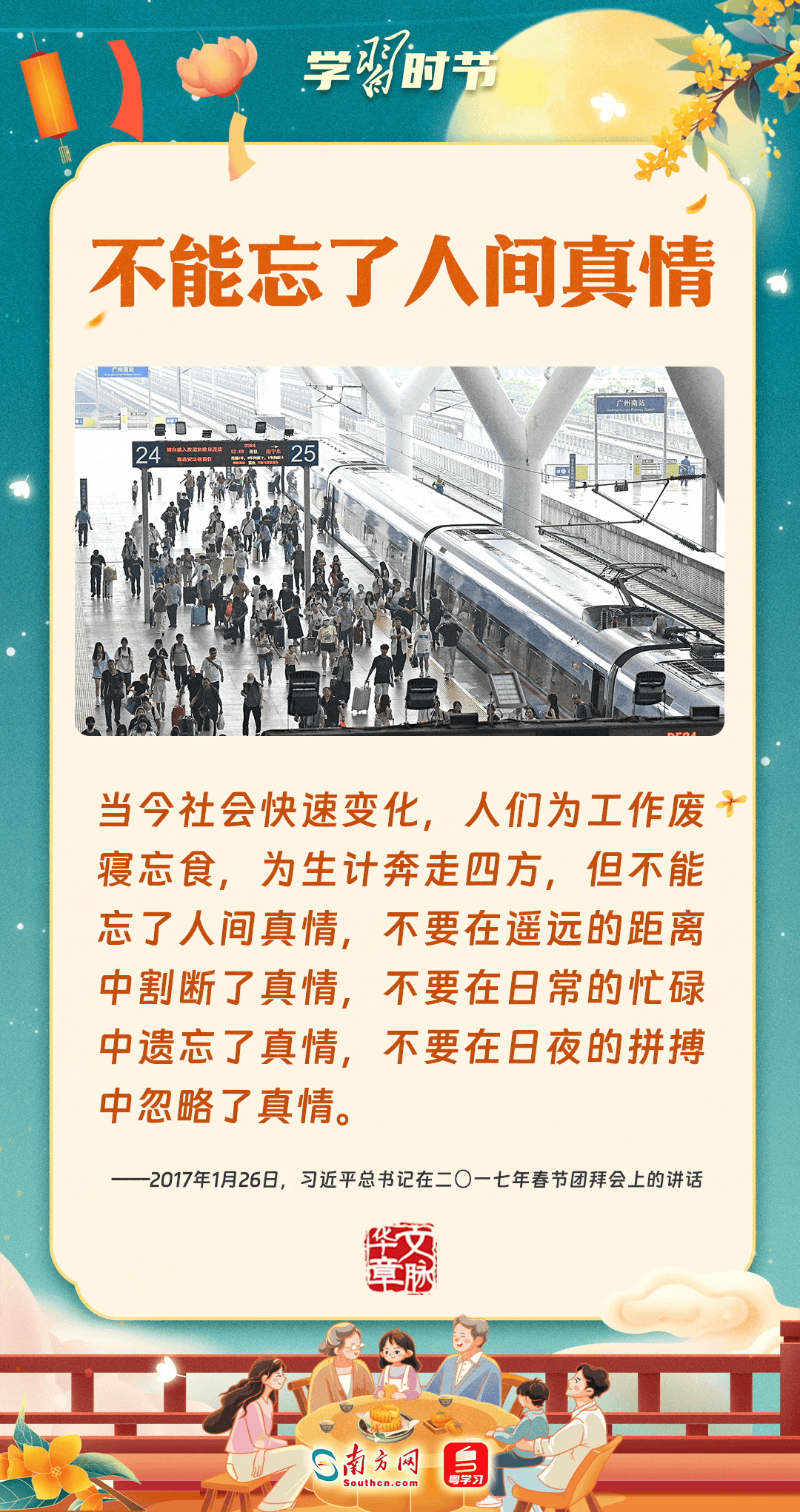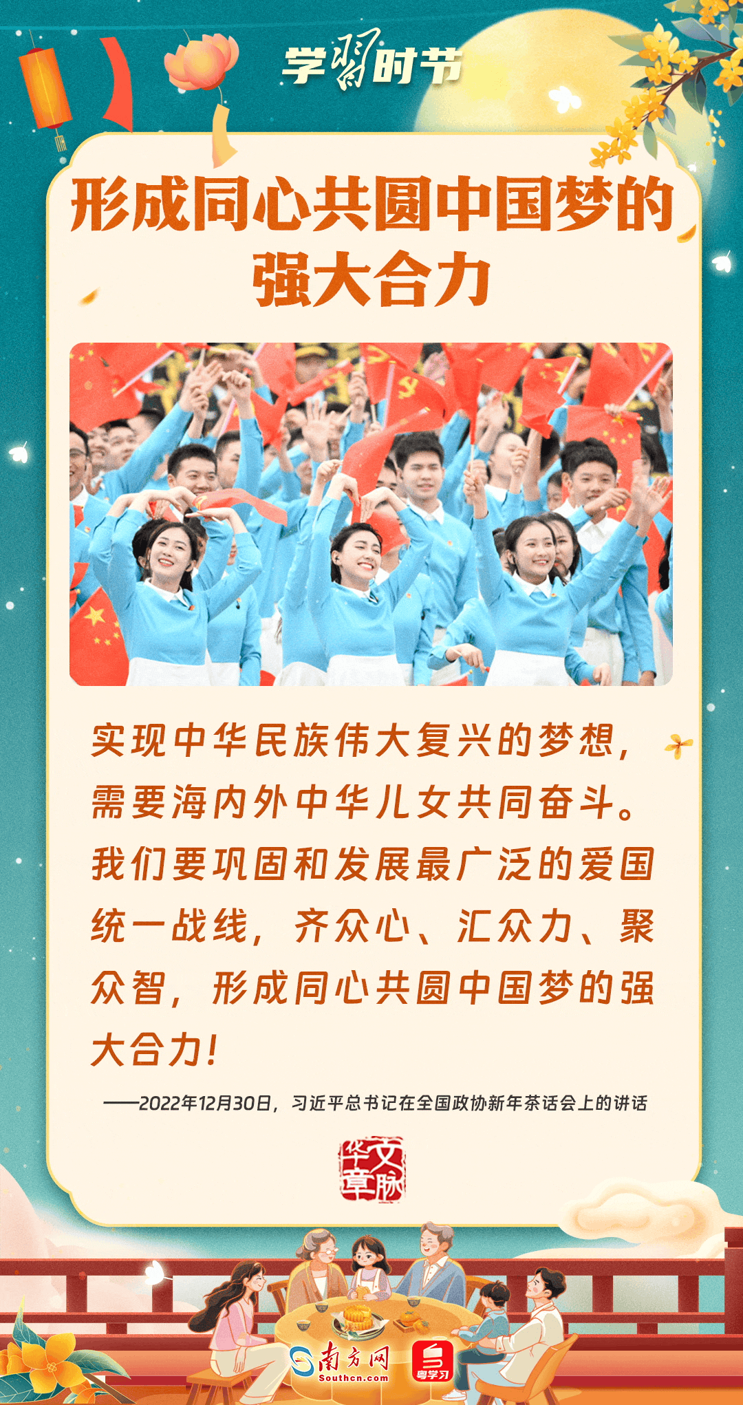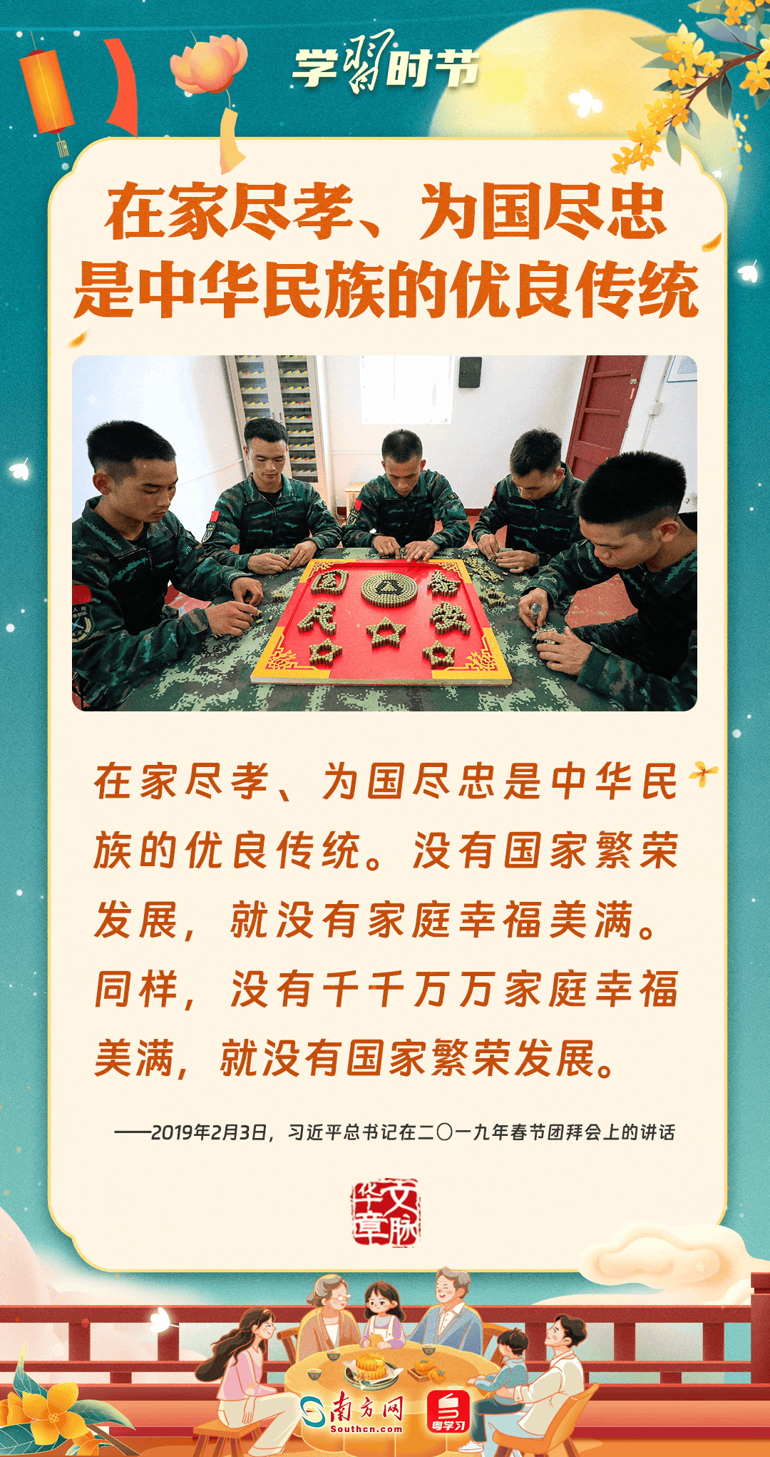明月寄相思,家國總關(guān)情。作為中華優(yōu)秀傳統(tǒng)文化的重要載體之一,中秋節(jié)不但寄托著海內(nèi)外華人對闔家團圓的美好期許,還承載著深厚的故鄉(xiāng)情、家國情。習近平總書記曾在多個場合深刻闡述個人、家庭與國家之間的關(guān)系,強調(diào)要厚植家國情懷,把實現(xiàn)個人夢、家庭夢融入國家夢、民族夢之中。中秋佳節(jié),讓我們一起回顧總書記那些經(jīng)典話語,共同感受他至深至厚的家國情懷。