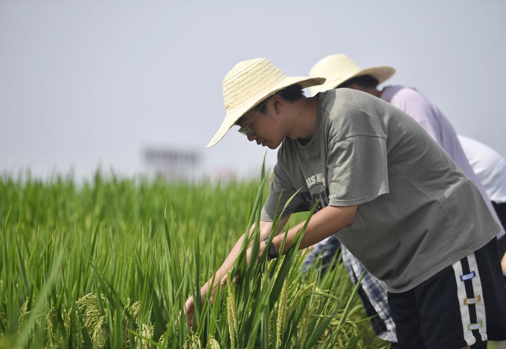2024年7月26日,長(zhǎng)期在永豐村高標(biāo)準(zhǔn)農(nóng)田駐守的四川農(nóng)業(yè)大學(xué)學(xué)生在田間觀察水稻生長(zhǎng)情況。