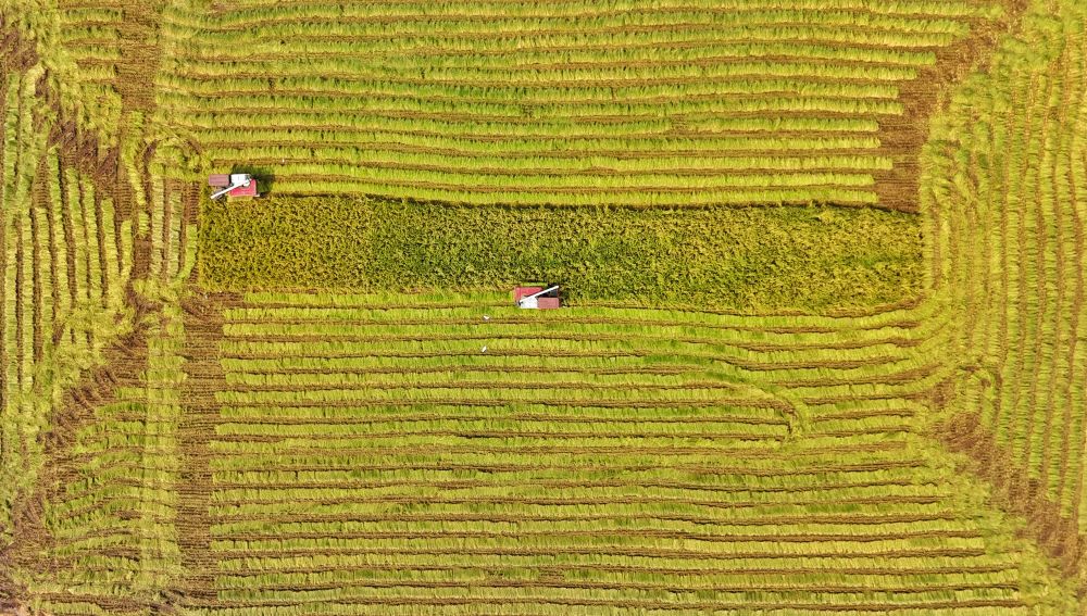 2024年8月22日,收割機(jī)在永豐村高標(biāo)準(zhǔn)農(nóng)田內(nèi)收割水稻(無(wú)人機(jī)照片)。團(tuán)隊(duì)預(yù)計(jì),2024年永豐村高標(biāo)準(zhǔn)農(nóng)田平均畝產(chǎn)將接近800公斤。