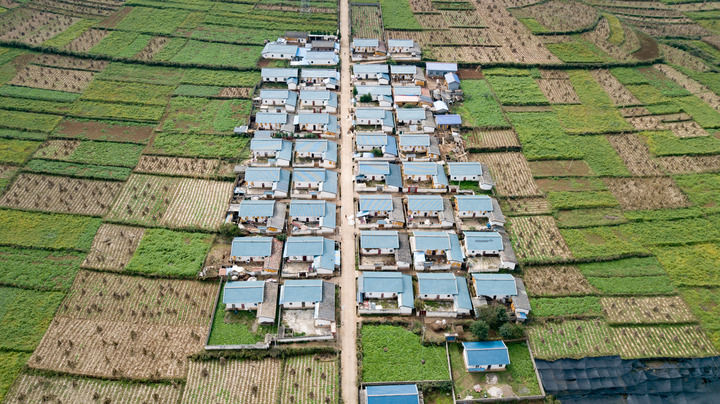 俯瞰四川省昭覺縣地莫鄉(xiāng)地莫村田園中的新居(2020年10月10日攝,無(wú)人機(jī)照片)。新華社記者 張笑宇 攝
