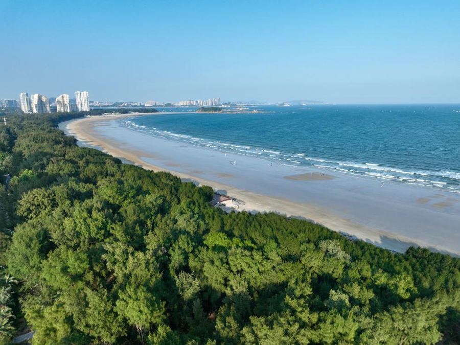 郁郁蔥蔥的東山縣沿海防護林(無人機拍攝)。新華社記者 姜克紅 攝