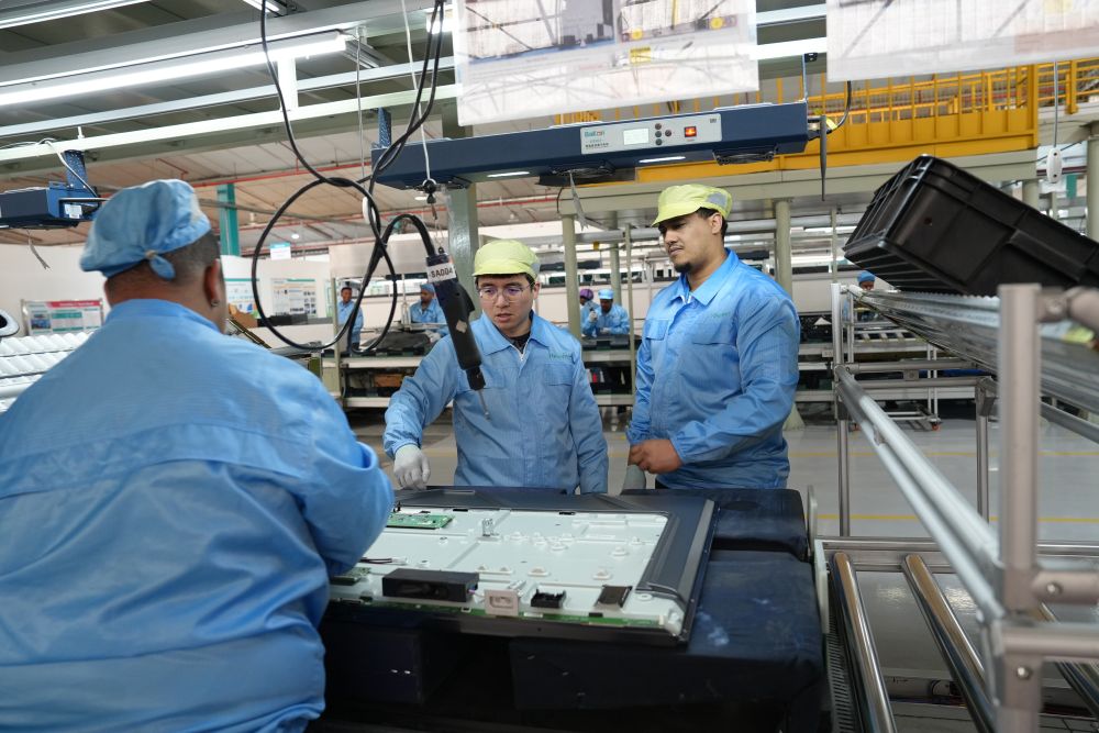 2024年8月14日,中方工程師(中)在南非開(kāi)普敦的海信南非工業(yè)園電視機(jī)生產(chǎn)線上指導(dǎo)當(dāng)?shù)貑T工工作。工業(yè)園已為當(dāng)?shù)貏?chuàng)造1000多個(gè)直接就業(yè)機(jī)會(huì)、5000多個(gè)間接就業(yè)崗位,帶動(dòng)地區(qū)產(chǎn)業(yè)鏈發(fā)展。