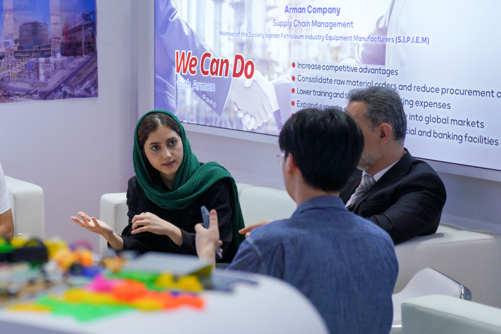 2024年9月15日,在位于北京的服貿(mào)會(huì)國(guó)家會(huì)議中心展區(qū),來(lái)自伊朗的參展商與中方參展人員交流。2024年一季度我國(guó)對(duì)伊朗市場(chǎng)采購(gòu)出口同比增長(zhǎng)15.2%。