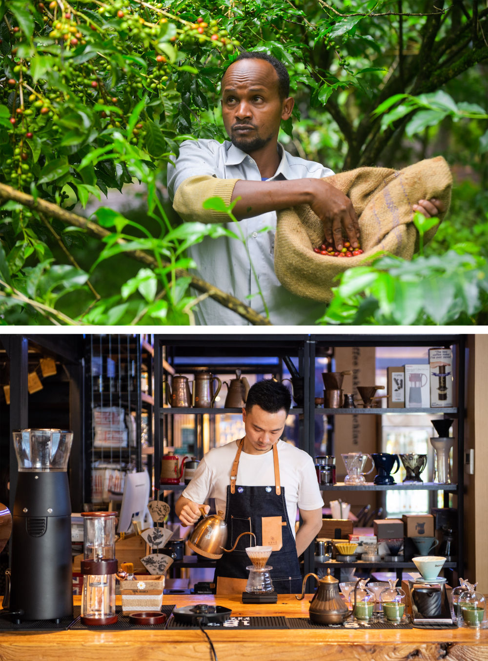 上圖:2021年9月22日,在埃塞俄比亞奧羅米亞州戈馬地區(qū)的一個(gè)咖啡園,農(nóng)民胡森·穆罕默德在采摘咖啡豆;下圖:2021年9月24日,在湖南省長(zhǎng)沙市高橋大市場(chǎng)非洲咖啡街一家咖啡館,咖啡師彭杰在制作咖啡飲品。隨著中國(guó)開(kāi)放的大門(mén)越開(kāi)越大、中國(guó)咖啡消費(fèi)的快速增長(zhǎng),埃塞俄比亞咖啡在中國(guó)越來(lái)越受歡迎。