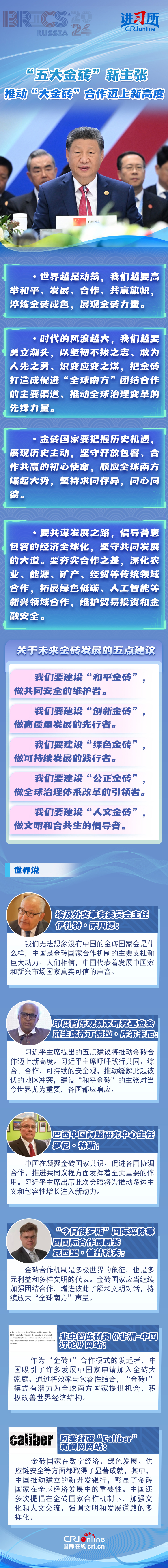 “時(shí)代的風(fēng)浪越大,我們?cè)揭铝⒊鳖^,以堅(jiān)韌不拔之志、敢為人先之勇、識(shí)變應(yīng)變之謀,把金磚打造成促進(jìn)‘全球南方’團(tuán)結(jié)合作的主要渠道、推動(dòng)全球治理變革的先鋒力量。”當(dāng)?shù)貢r(shí)間10月23日,習(xí)近平主席在俄羅斯喀山出席金磚國(guó)家領(lǐng)導(dǎo)人第十六次會(huì)晤并發(fā)表重要講話,提出共建“和平金磚”“創(chuàng)新金磚”“綠色金磚”“公正金磚”“人文金磚”,為“大金磚合作”擘畫(huà)藍(lán)圖。