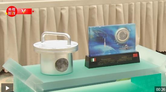 工藝擺件以嫦娥五號探月為設(shè)計元素,月球部分裝有月壤??蒲袠悠窞樵氯犁P取樣和鉆取樣,展現(xiàn)了中意航天領(lǐng)域合作高水平。