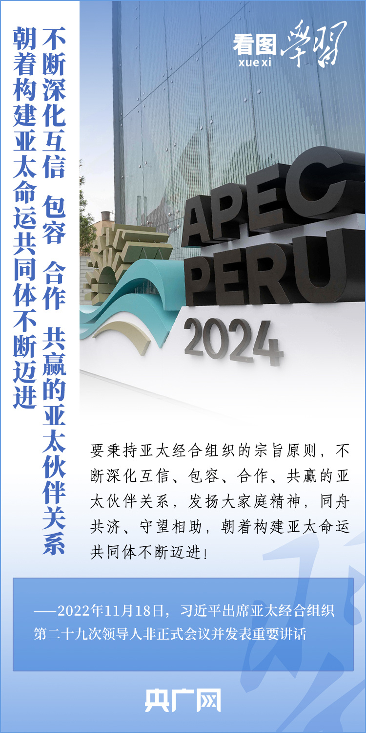 亞太經(jīng)合組織(APEC)是亞太地區(qū)層級最高、領域最廣、最具影響力的經(jīng)濟合作機制。11月13日至17日,習近平主席赴利馬出席亞太經(jīng)合組織第三十一次領導人非正式會議并對秘魯進行國事訪問。從“亞太夢想”到“APEC方式”,從“亞太伙伴關系”到“亞太命運共同體”……2013年以來,習近平主席出席或主持歷次APEC領導人非正式會議,就全球及地區(qū)形勢、亞太區(qū)域合作、APEC未來發(fā)展等一系列重大問題闡釋中國主張,推動不斷深化互信、包容、合作、共贏的亞太伙伴關系,建設開放、活力、強韌、和平的亞太共同體。一起來學習!