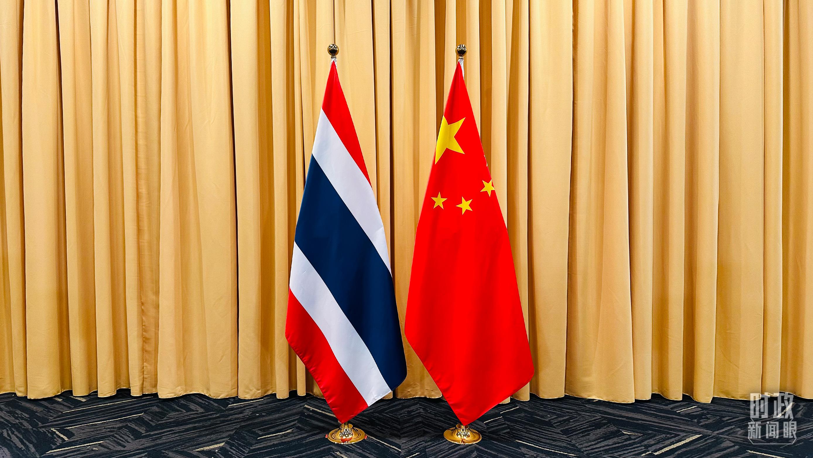 會(huì)見現(xiàn)場的中泰兩國國旗。(總臺(tái)央視記者范一鳴拍攝)