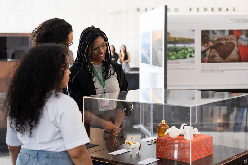 2024年8月15日,在巴西首都巴西利亞舉行的“紐帶:美麗的巴西,美麗的中國”展覽上,參觀者欣賞中國工藝品。新華社記者 王天聰攝