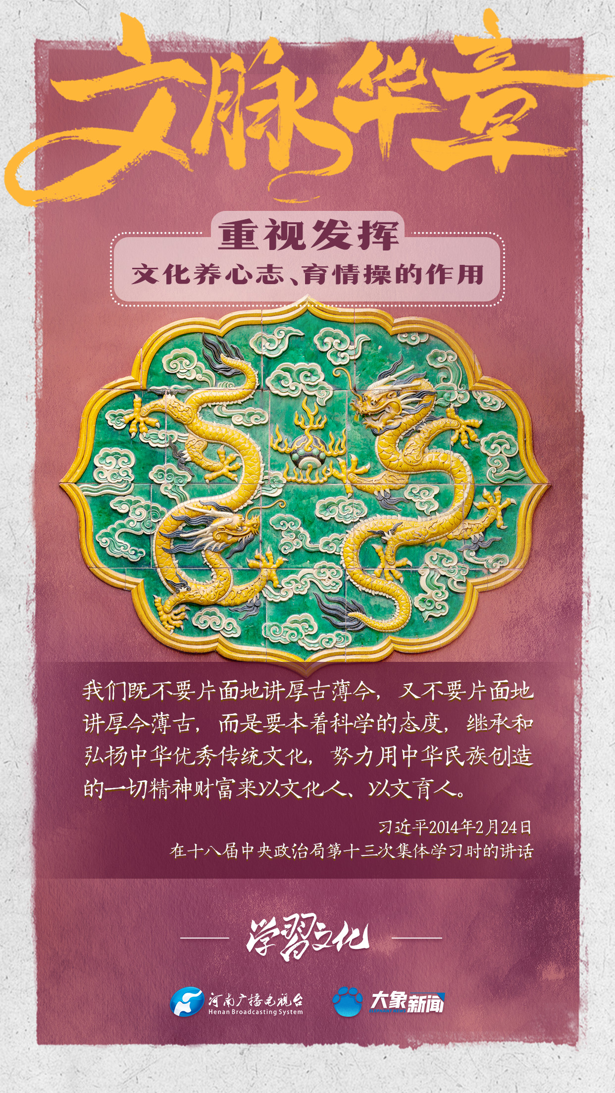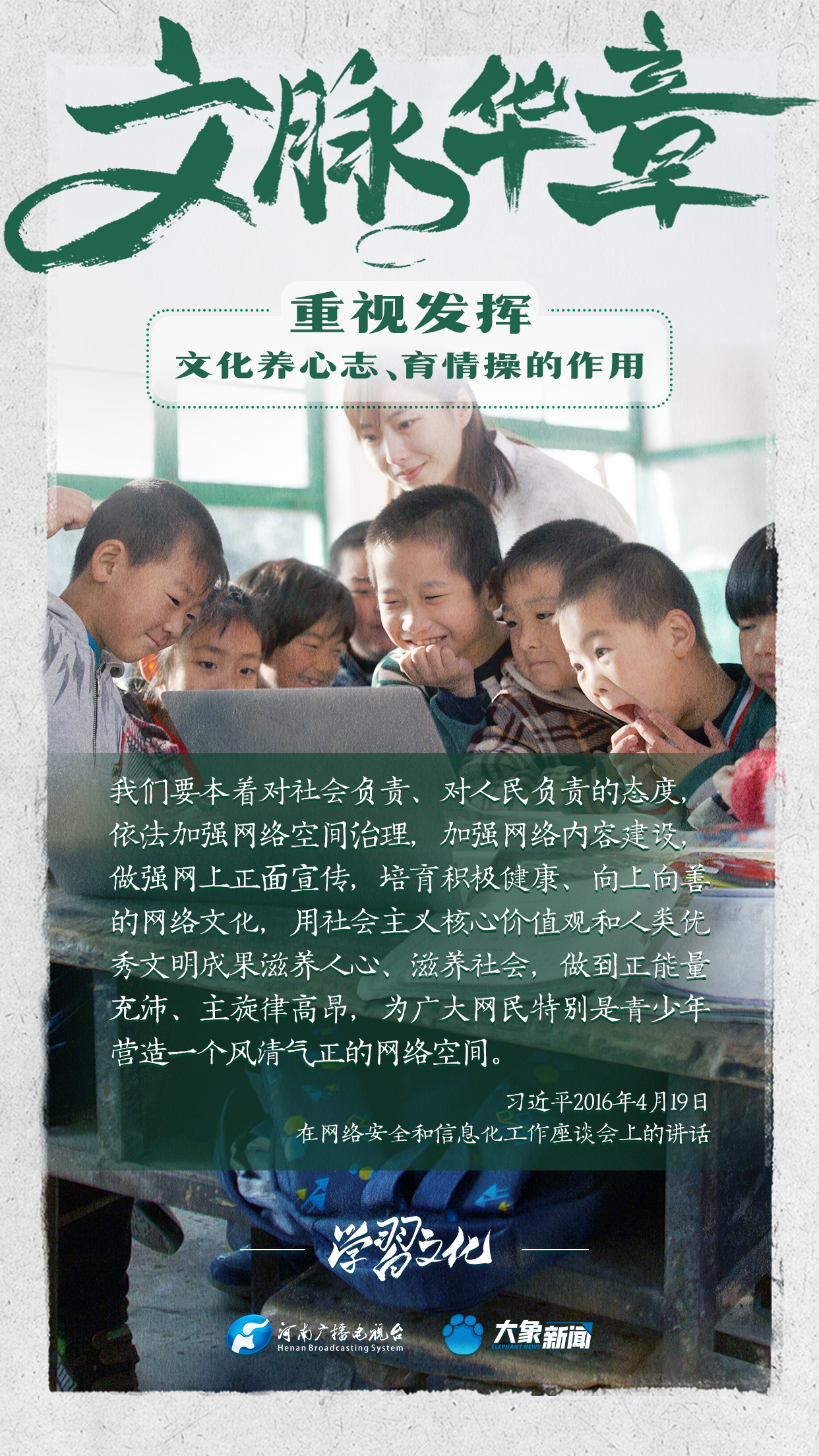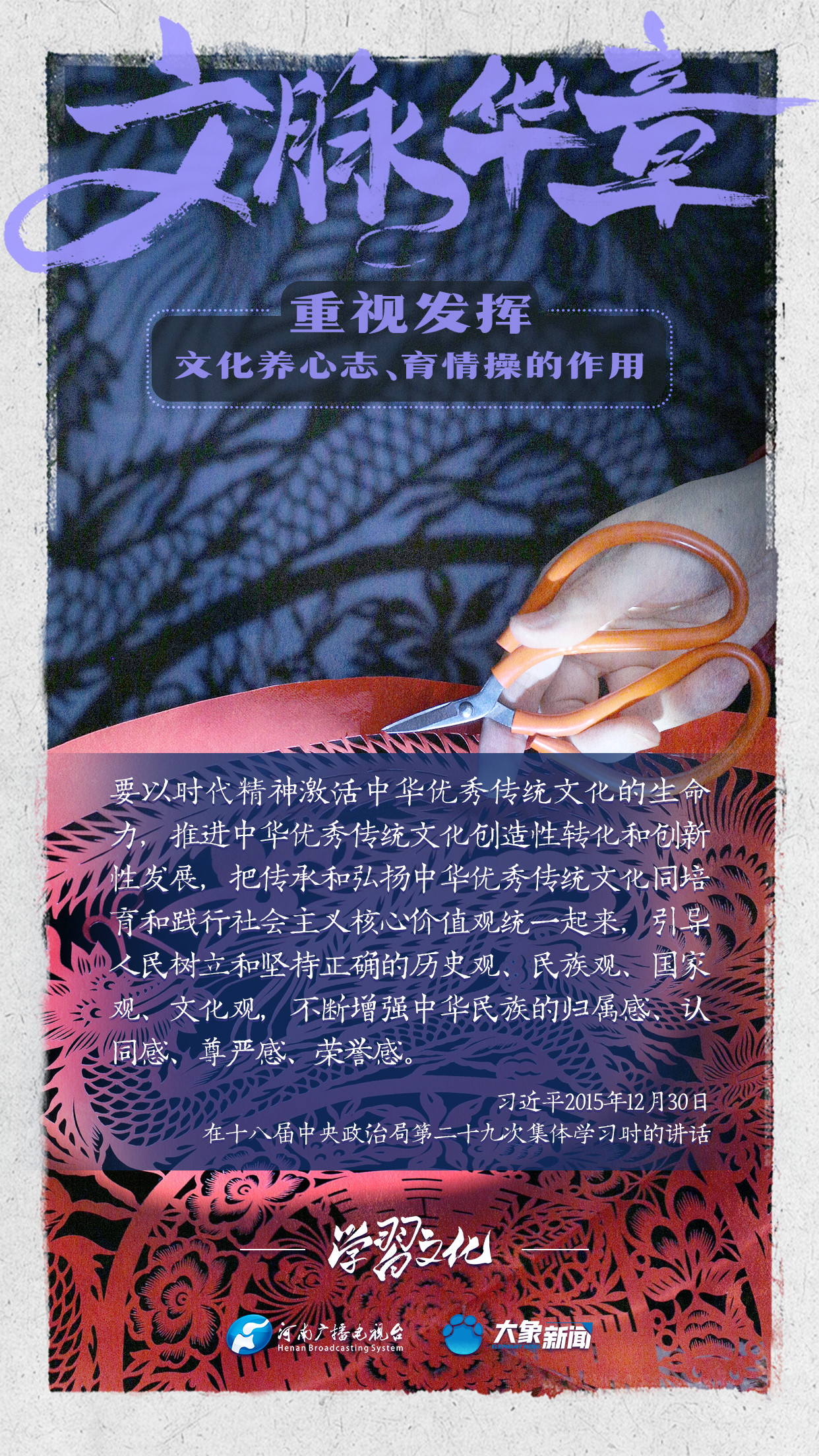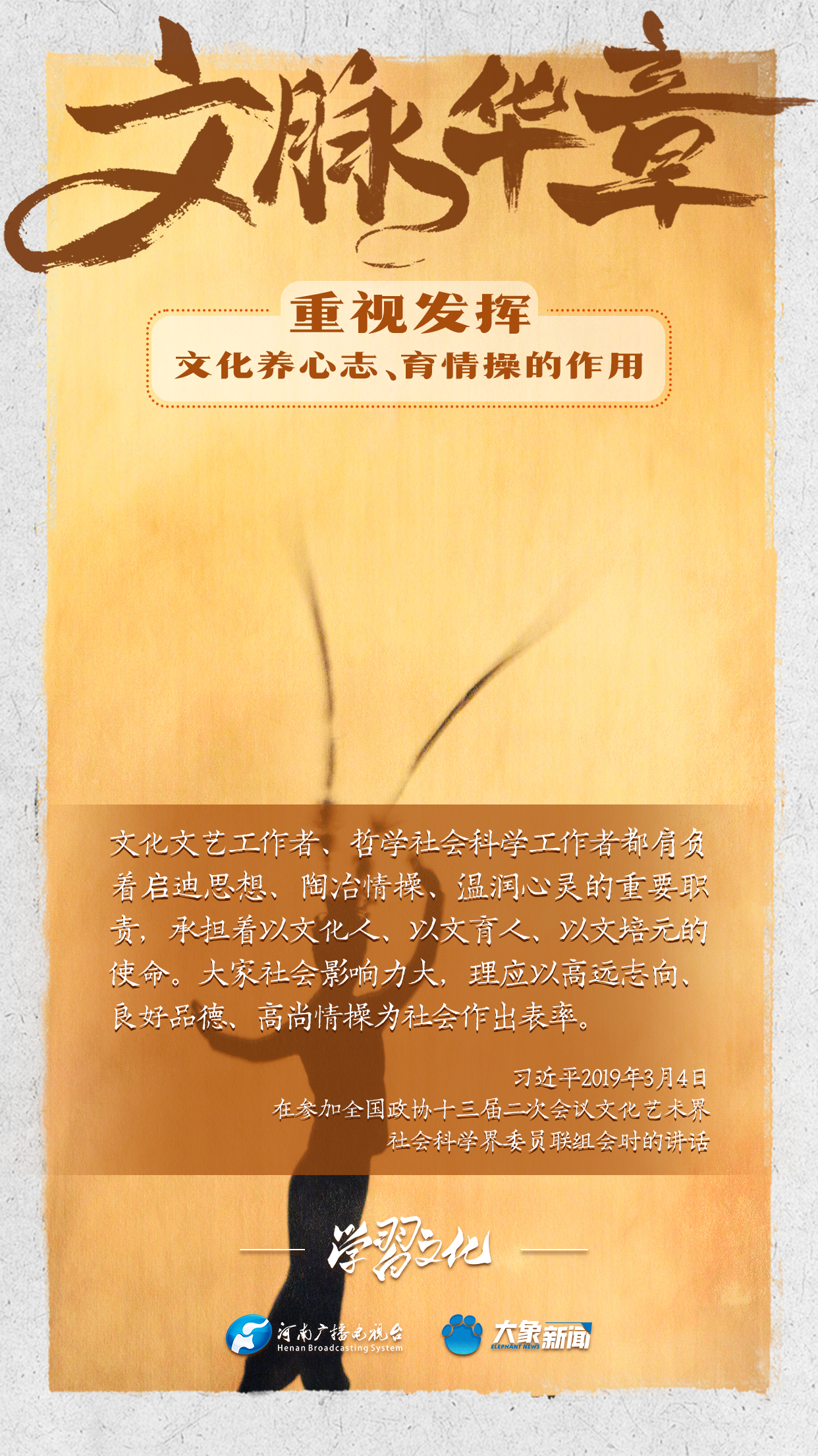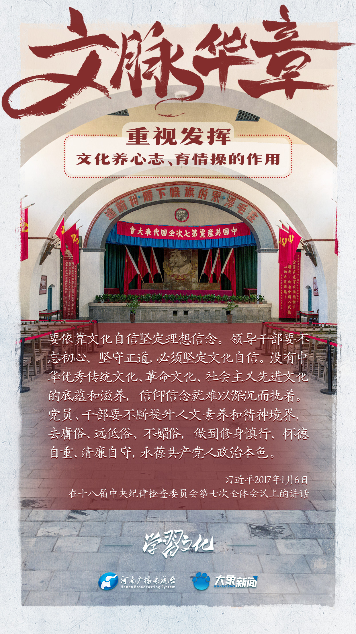 習(xí)近平總書記在主持中共中央政治局第十七次集體學(xué)習(xí)時強調(diào),重視發(fā)揮文化養(yǎng)心志、育情操的作用,涵養(yǎng)全民族昂揚奮發(fā)的精神氣質(zhì)。總書記高度重視文化的作用,發(fā)表了一系列重要講話,倡導(dǎo)以文載道、以文傳聲、以文化人。我們一起學(xué)習(xí)。