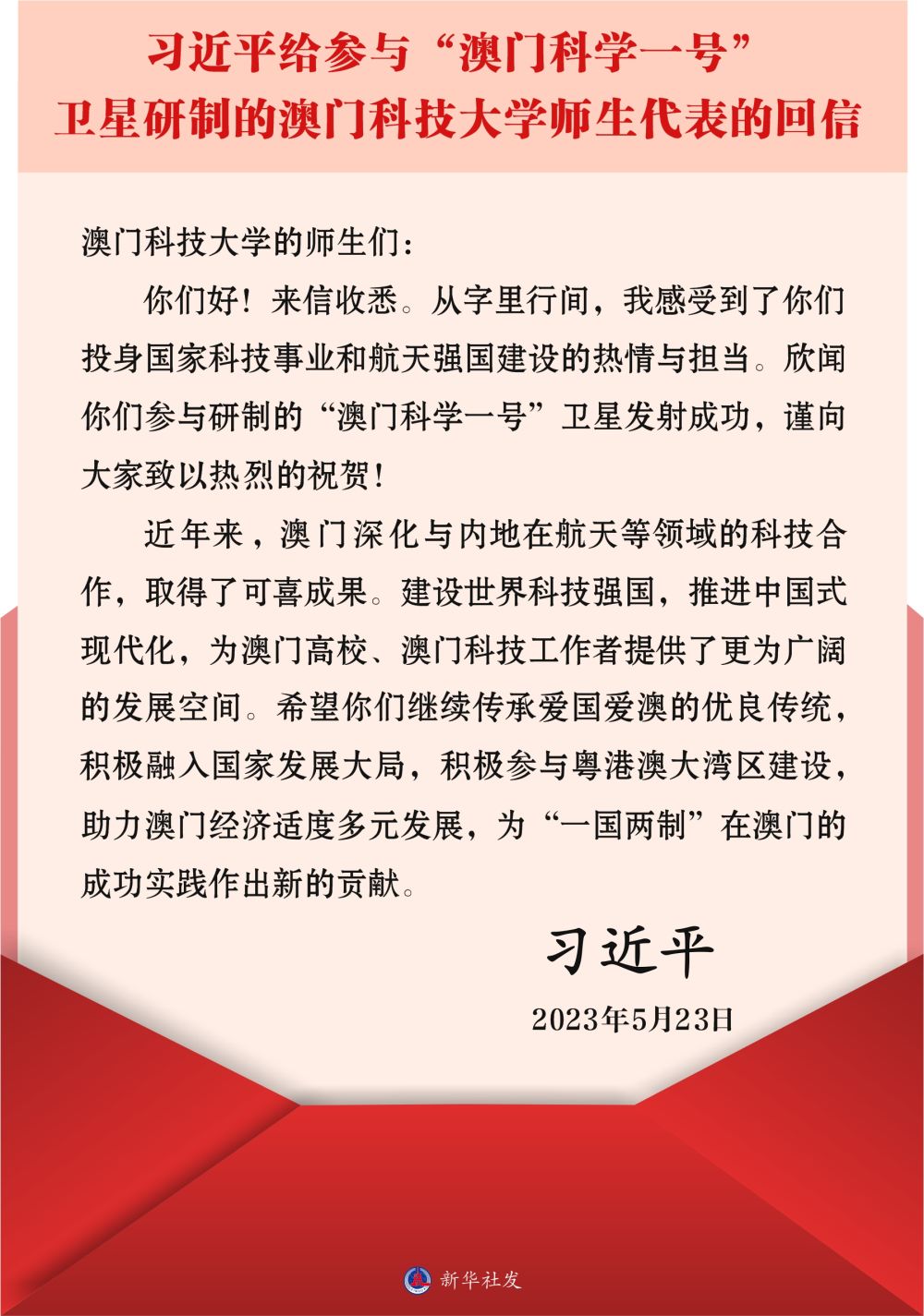 參與衛(wèi)星研制的澳門科技大學(xué)18名師生代表給習(xí)近平主席寫信,匯報(bào)衛(wèi)星成功發(fā)射的喜訊和參與衛(wèi)星研制工作的感受。5月23日,習(xí)近平主席給參與“澳科一號(hào)”衛(wèi)星研制的師生代表回信,對(duì)他們予以親切勉勵(lì)。