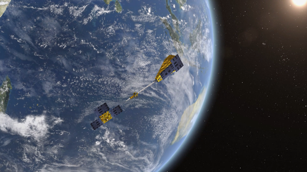圖為“澳科一號(hào)”衛(wèi)星在軌示意圖(右為A星,左為B星)。