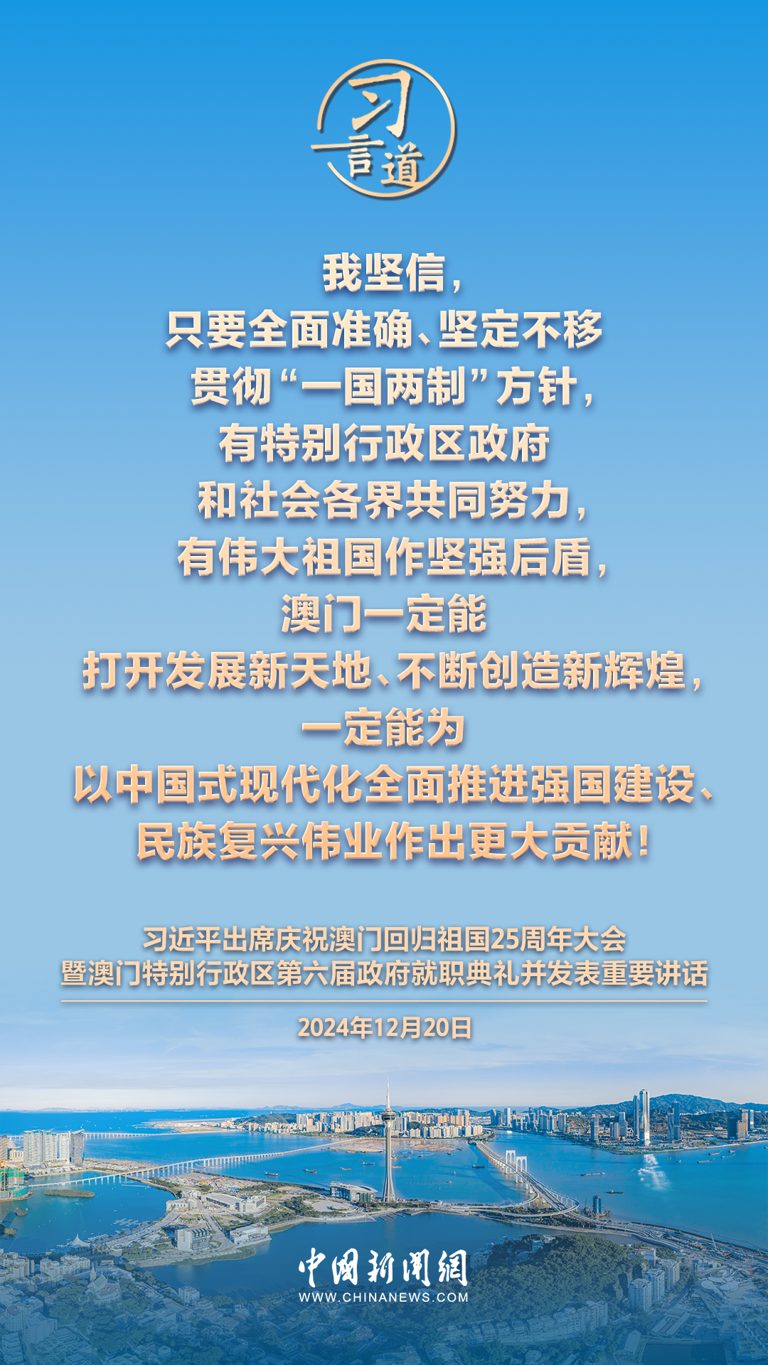 慶祝澳門回歸祖國25周年大會暨澳門特別行政區(qū)第六屆政府就職典禮20日在澳門東亞運動會體育館隆重舉行。中共中央總書記、國家主席、中央軍委主席習近平出席并發(fā)表重要講話,習近平指出——