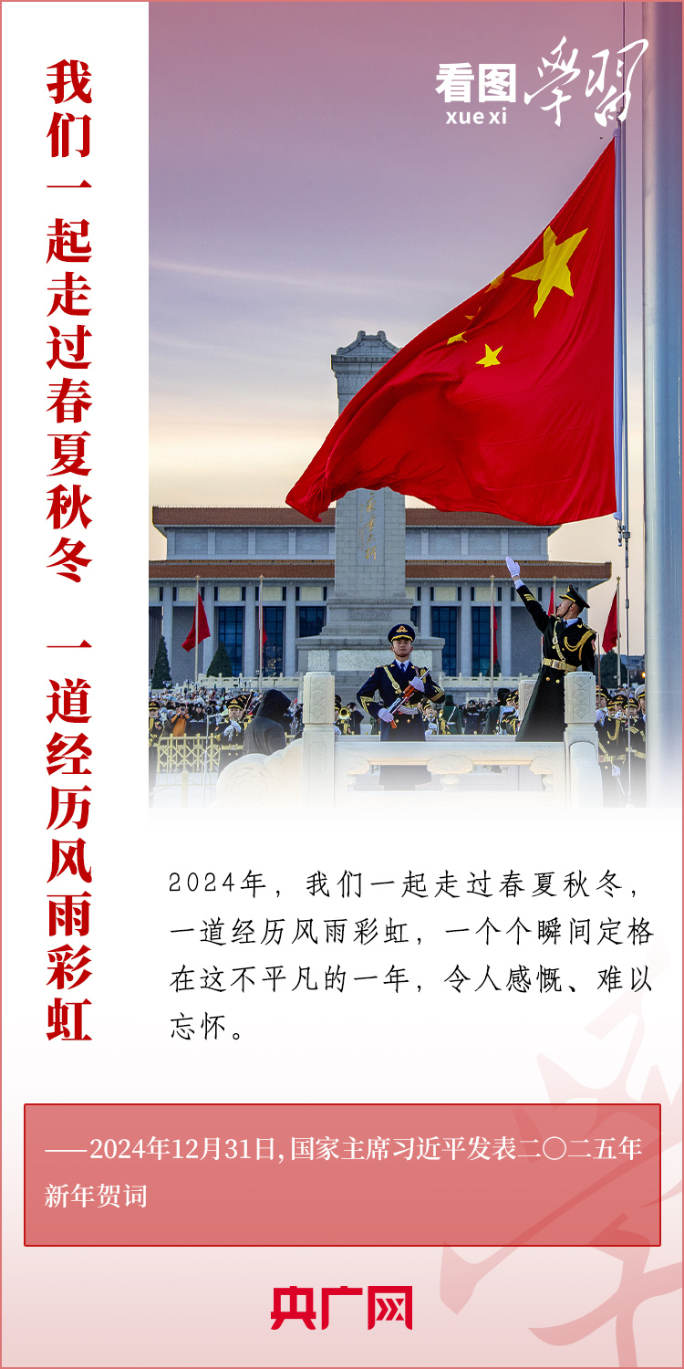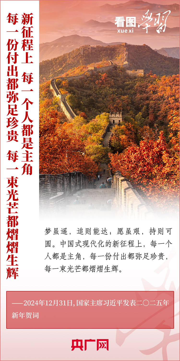“夢(mèng)雖遙,追則能達(dá);愿雖艱,持則可圓?!毙履昵跋?,習(xí)近平主席發(fā)表二〇二五年新年賀詞。在溫暖有力的講述中,習(xí)主席深情回望過(guò)去一年中國(guó)不平凡的奮斗歷程、精彩瞬間,感慨大家一道經(jīng)歷的風(fēng)雨彩虹、難忘時(shí)刻,贊美無(wú)數(shù)為夢(mèng)想拼搏的勞動(dòng)者、建設(shè)者、創(chuàng)業(yè)者。習(xí)主席說(shuō),中國(guó)式現(xiàn)代化的新征程上,每一個(gè)人都是主角,每一份付出都彌足珍貴,每一束光芒都熠熠生輝。讓我們充滿信心,在新的一年接續(xù)奮斗!