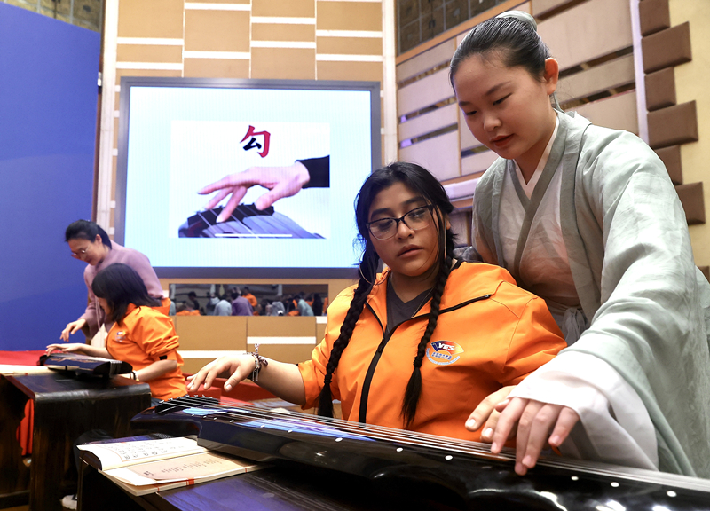 2024年3月20日,美國(guó)華盛頓州中學(xué)生代表團(tuán)北京大學(xué)交流活動(dòng)在北京大學(xué)英杰交流中心舉行。圖為來(lái)自華盛頓州的中學(xué)生體驗(yàn)古琴。