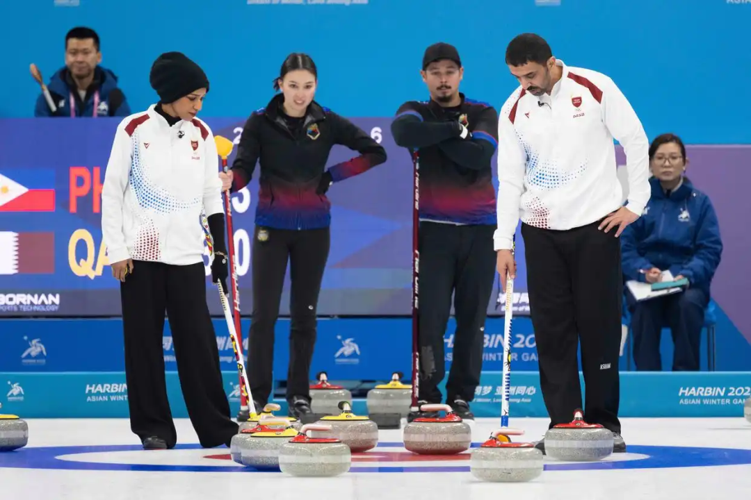 2月5日,亞冬會冰壺混雙循環(huán)賽B組第3輪比賽中,菲律賓隊11比3戰(zhàn)勝卡塔爾隊。