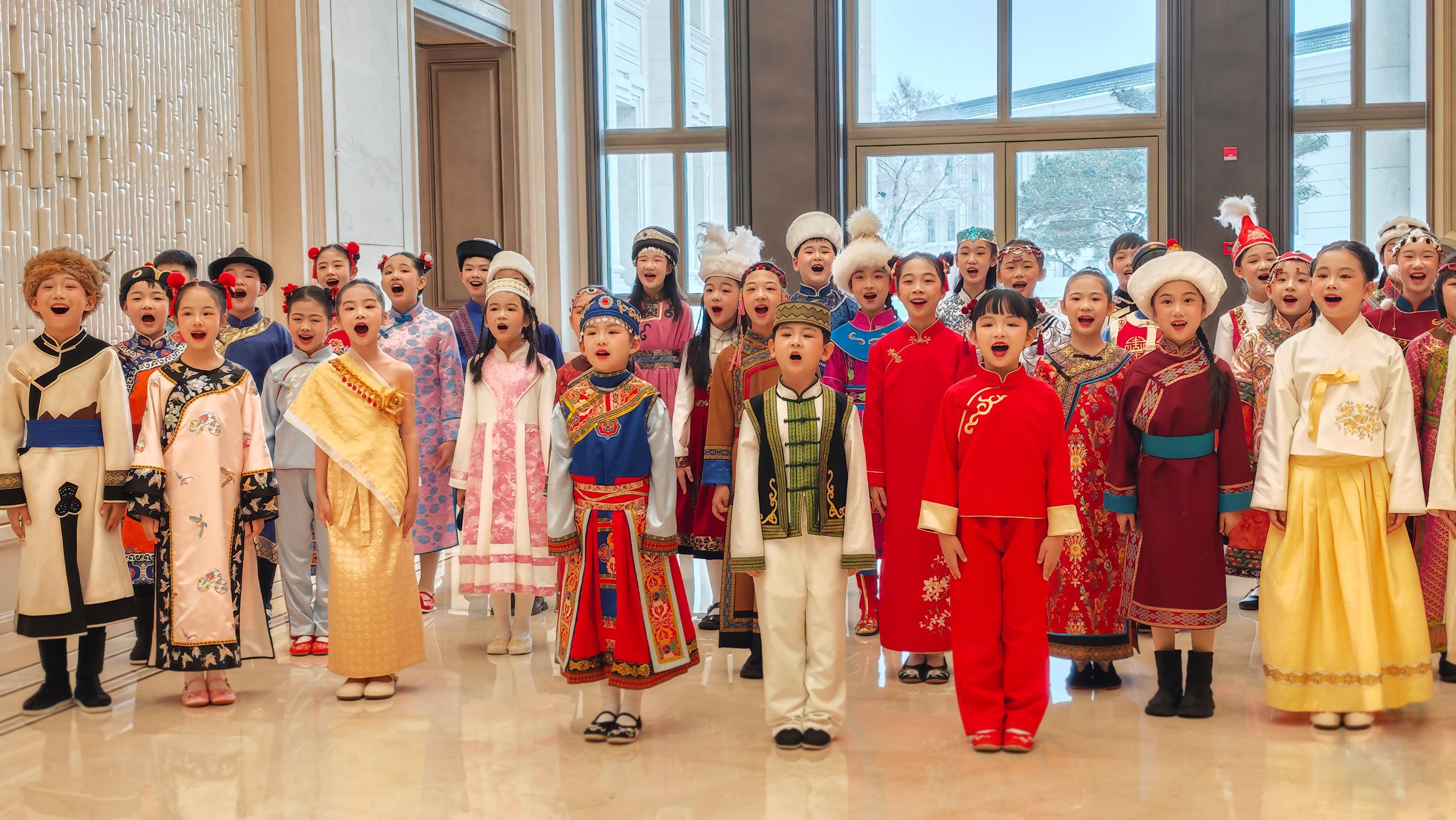 第九屆亞冬會(huì)開幕式歡迎宴會(huì)現(xiàn)場(chǎng),少年兒童表演民歌《烏蘇里船歌》。